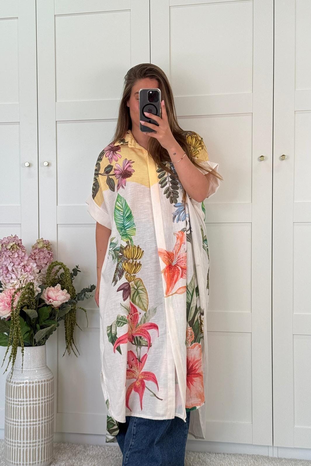 Lange blouse van A-bee met kleurrijke bloemenprint. De witte achtergrond is versierd met gele, roze en oranje bloemen en groene bladeren. De blouse heeft een klassieke kraag en knopen tot onderaan.