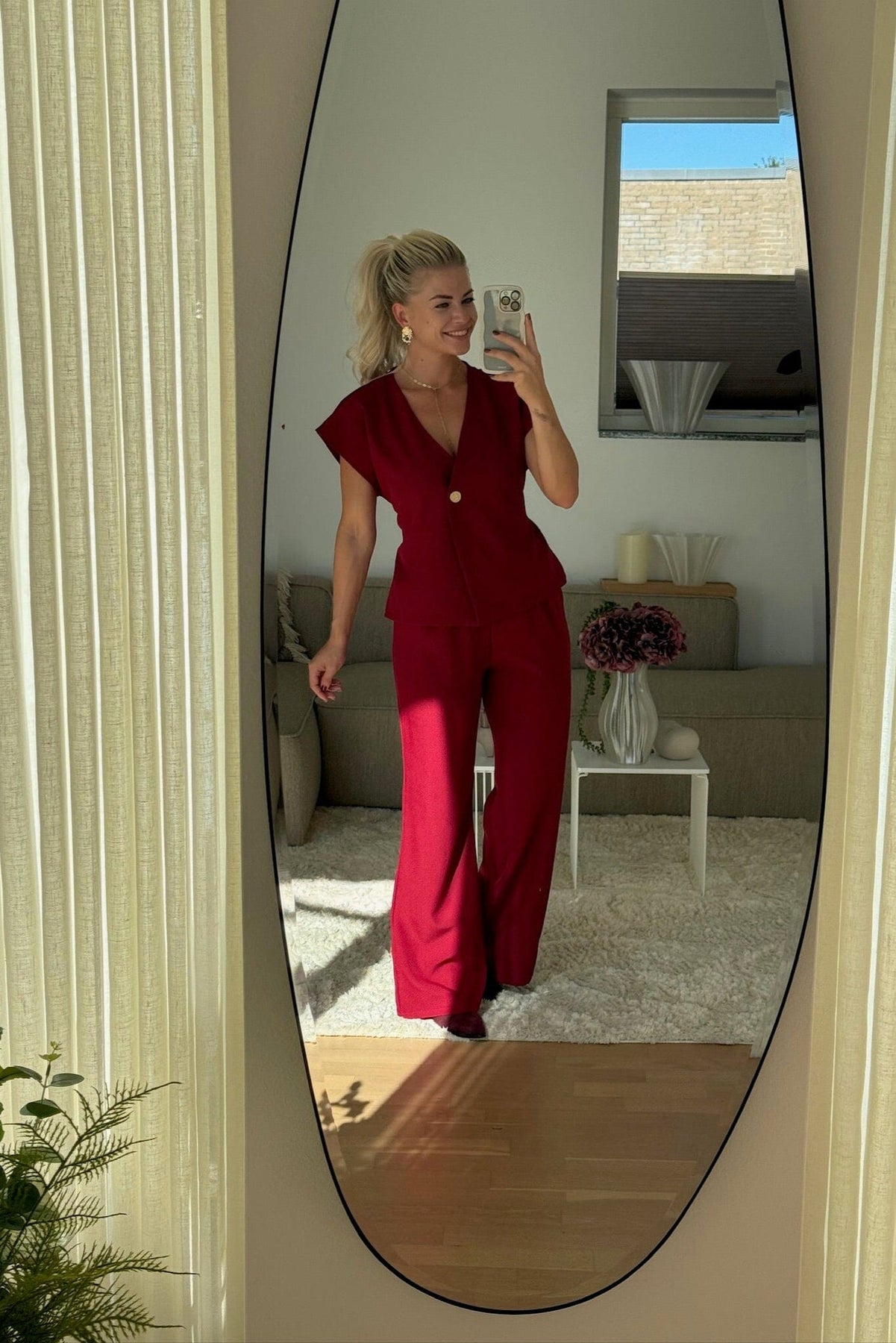 Bordeauxkleurige broek van A-bee met hoge taille en wijde pijpen. De broek heeft een losse pasvorm en valt tot op de vloer.