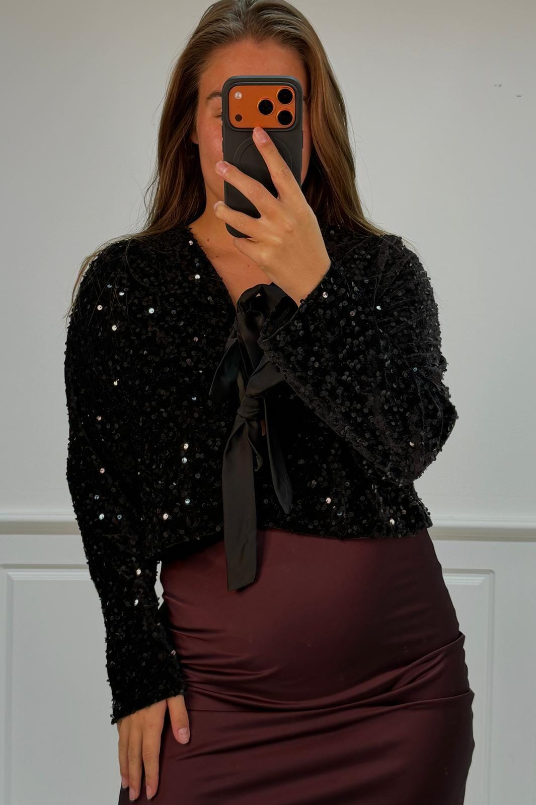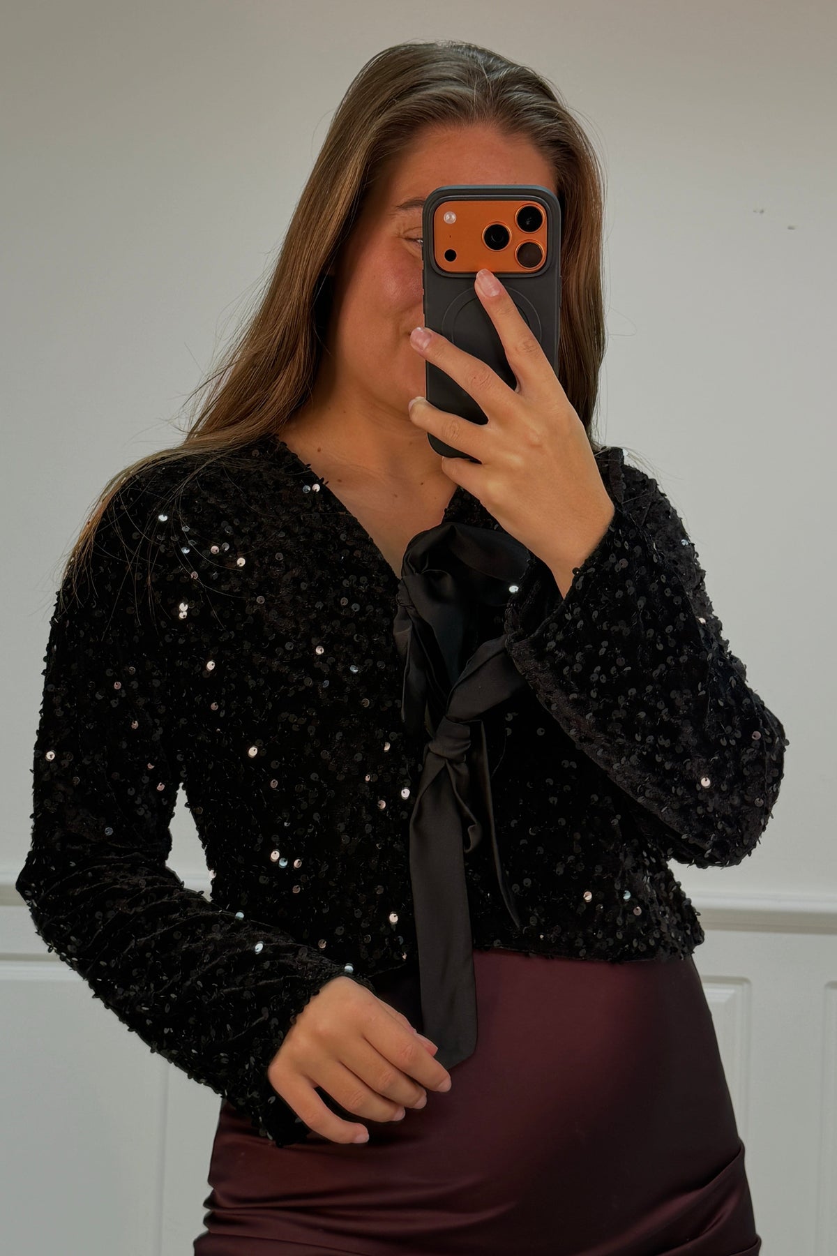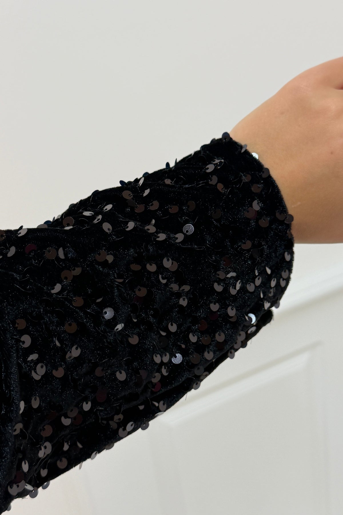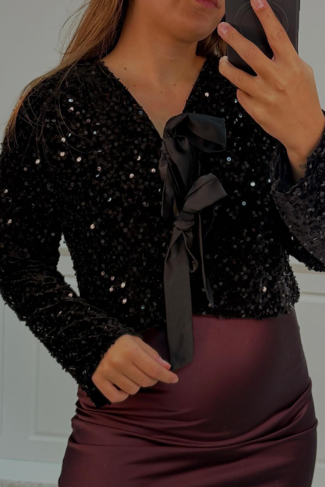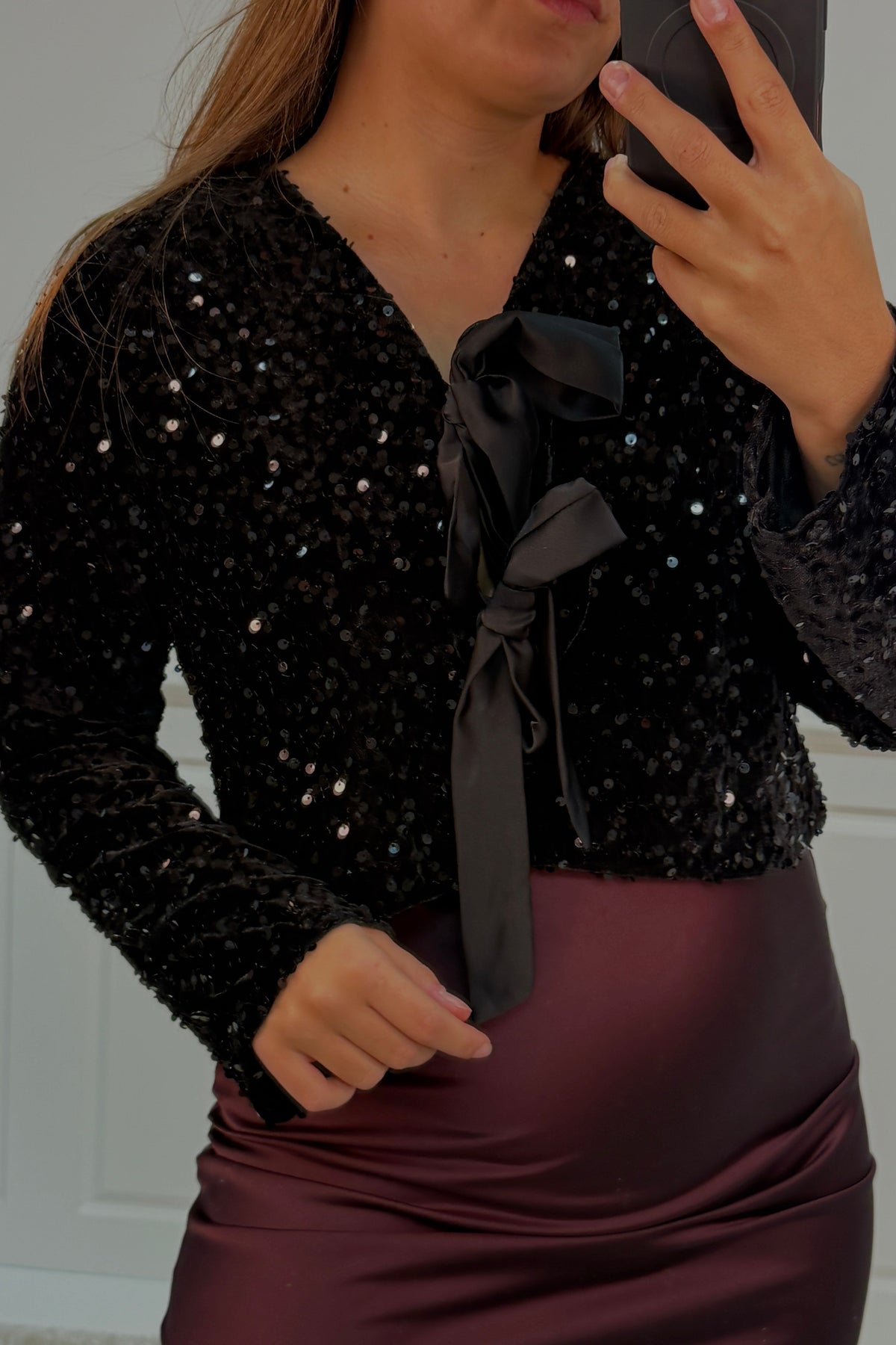 Zwarte blouse van A-bee met pailletten en strikdetails. De blouse heeft een V-hals met veterluiting en lange mouwen. Het glinsterende oppervlak en de decoratieve strikken maken het geschikt voor feestelijke gelegenheden.