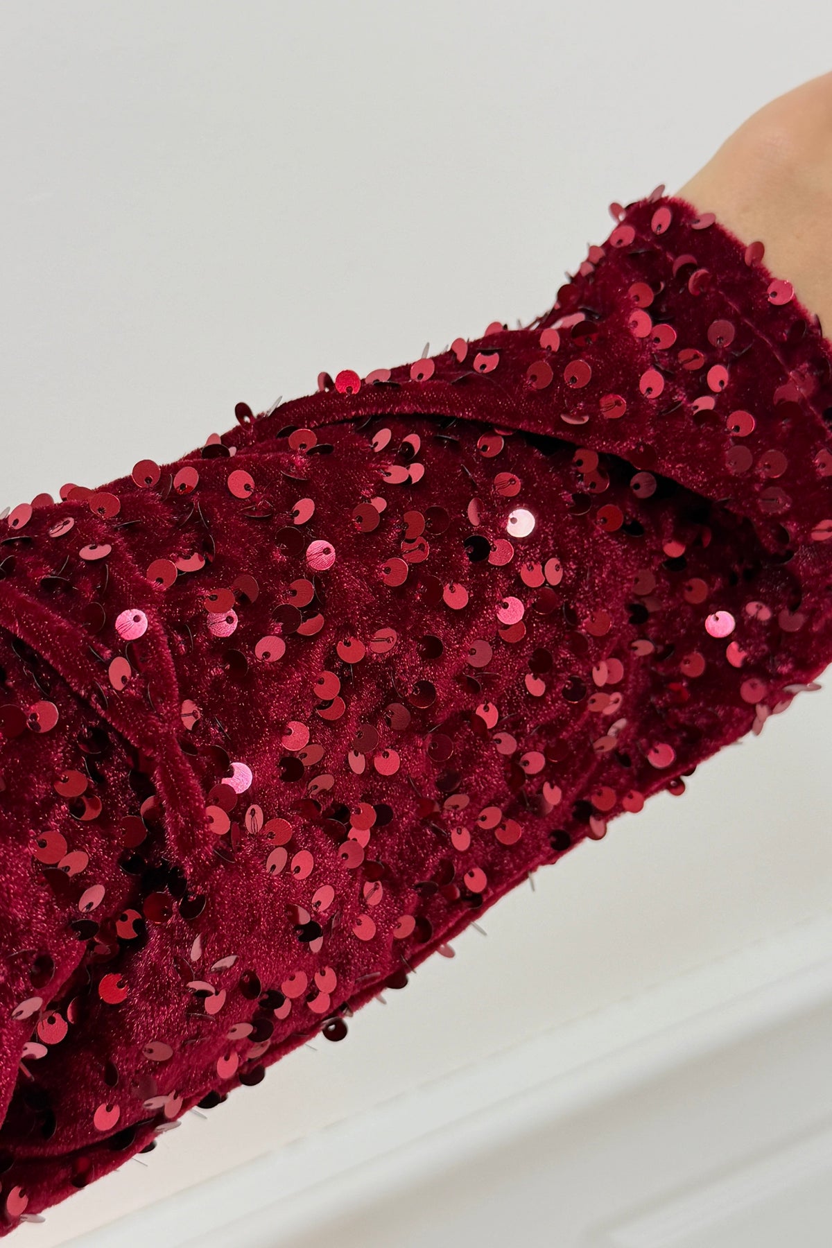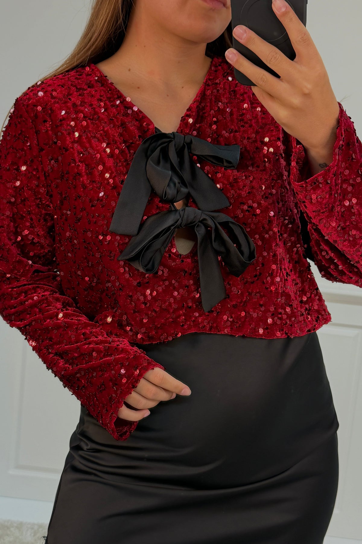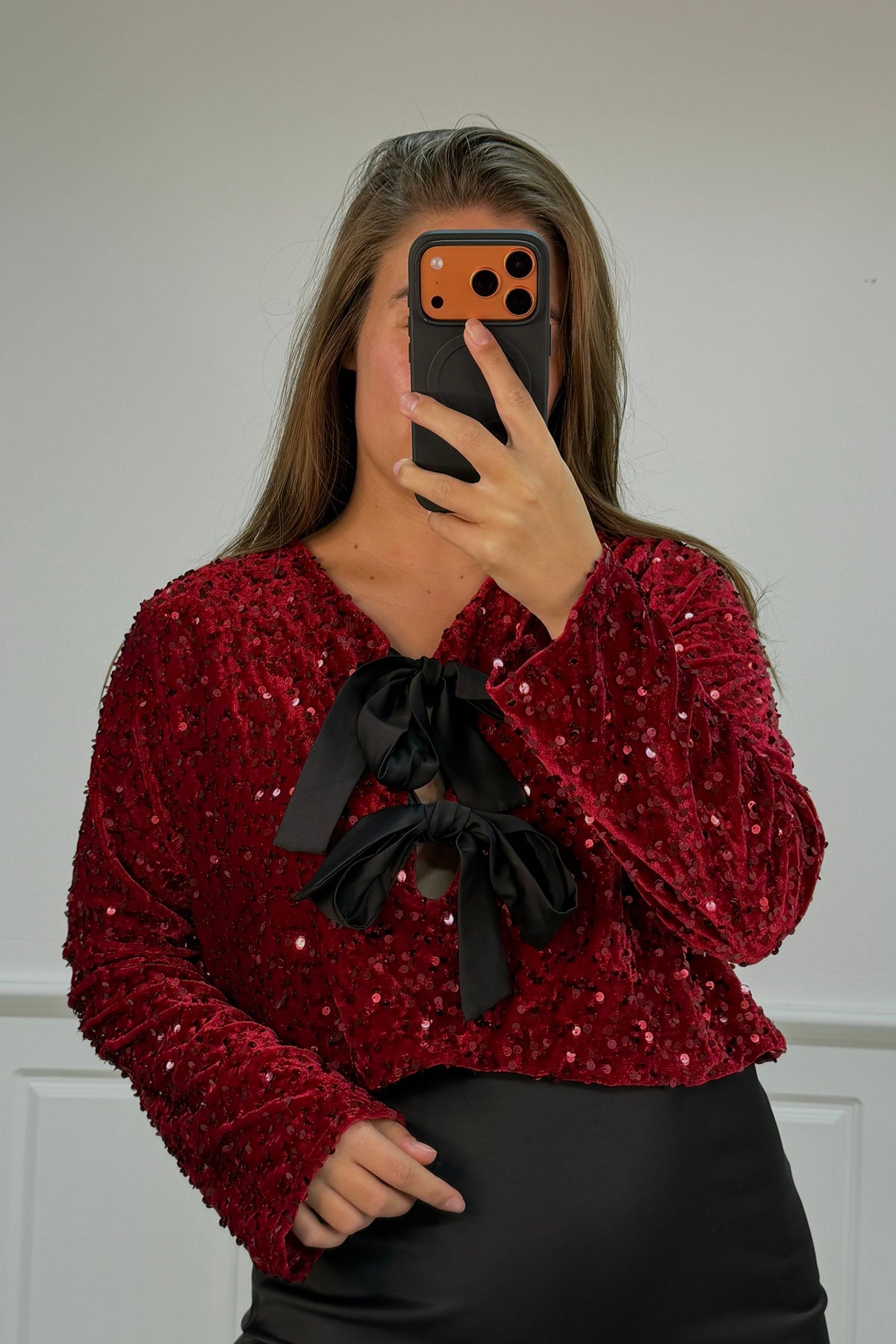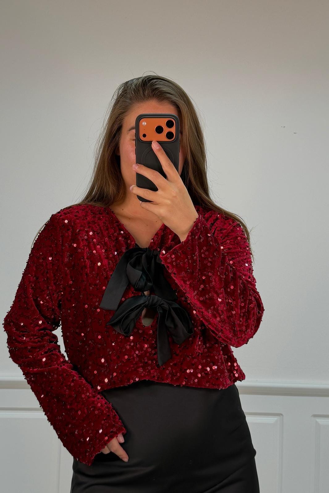 Bordeauxkleurige blouse van A-bee met overal pailletten. Hij heeft lange mouwen, een V-hals en een zwarte strik bij de hals. De blouse sluit met een koord en heeft een normale pasvorm.