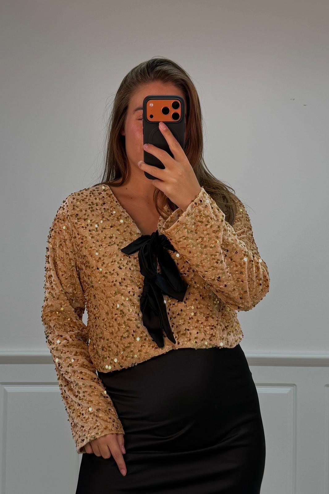Goudkleurige blouse van A-bee met pailletten over het hele oppervlak. Het heeft lange mouwen, een V-hals en zwarte strikdetails bij de hals.