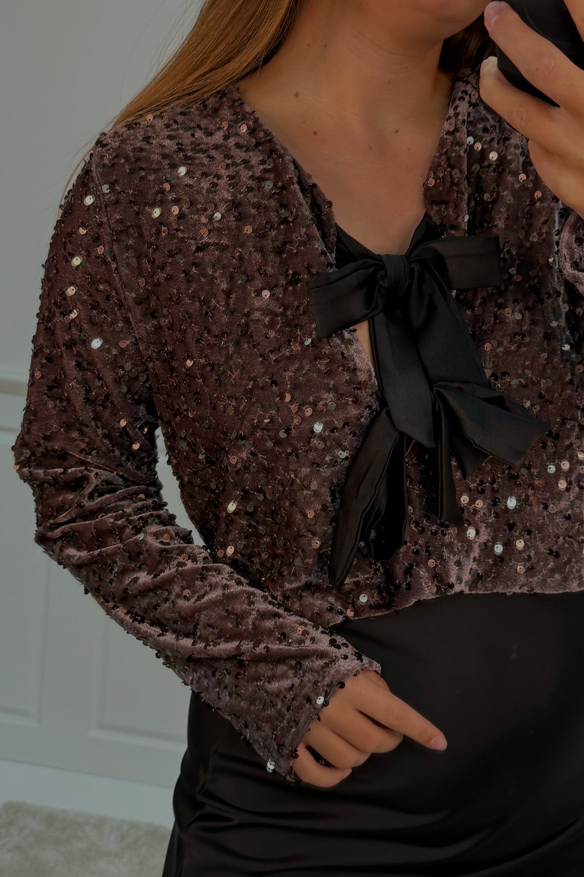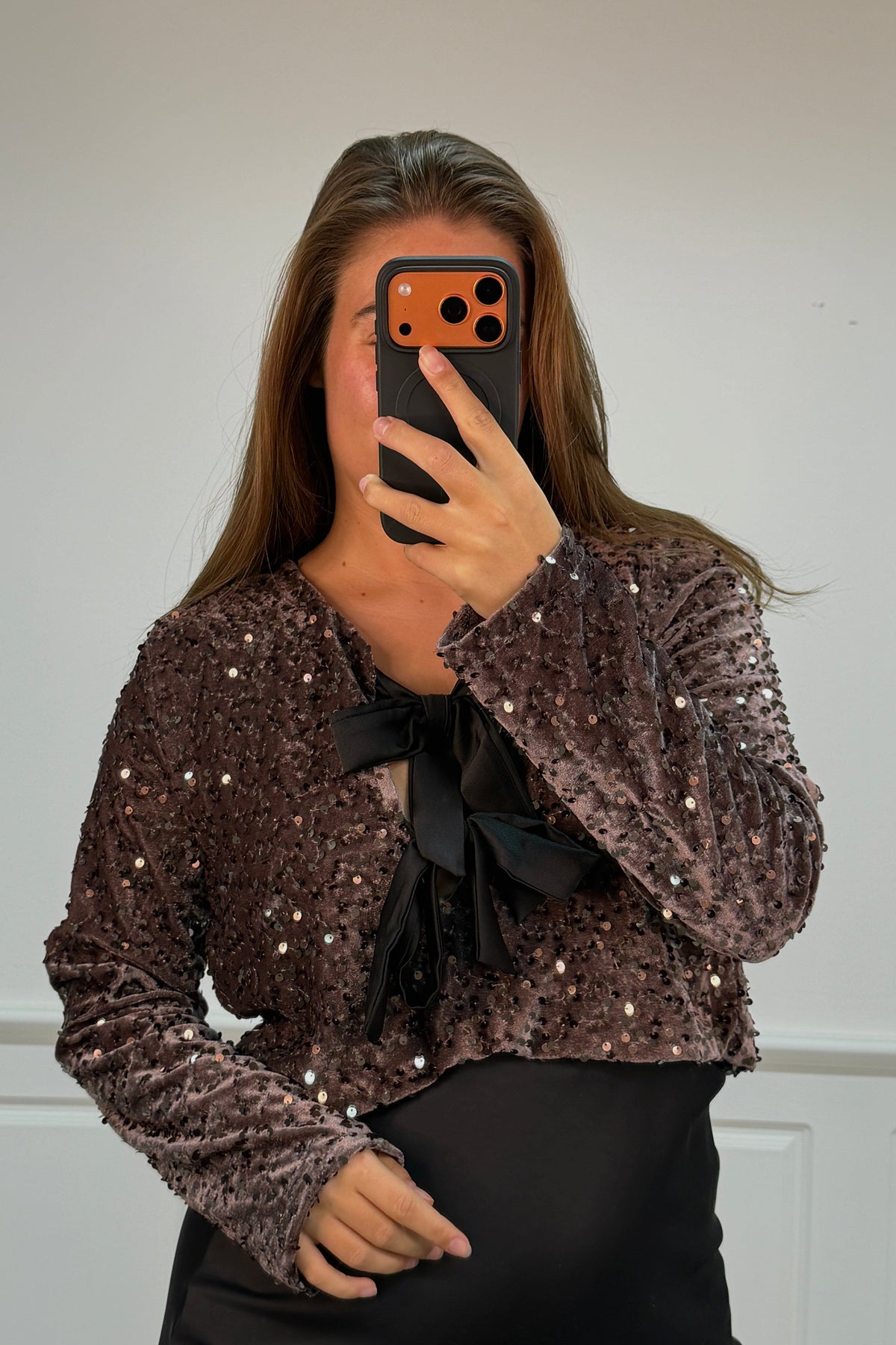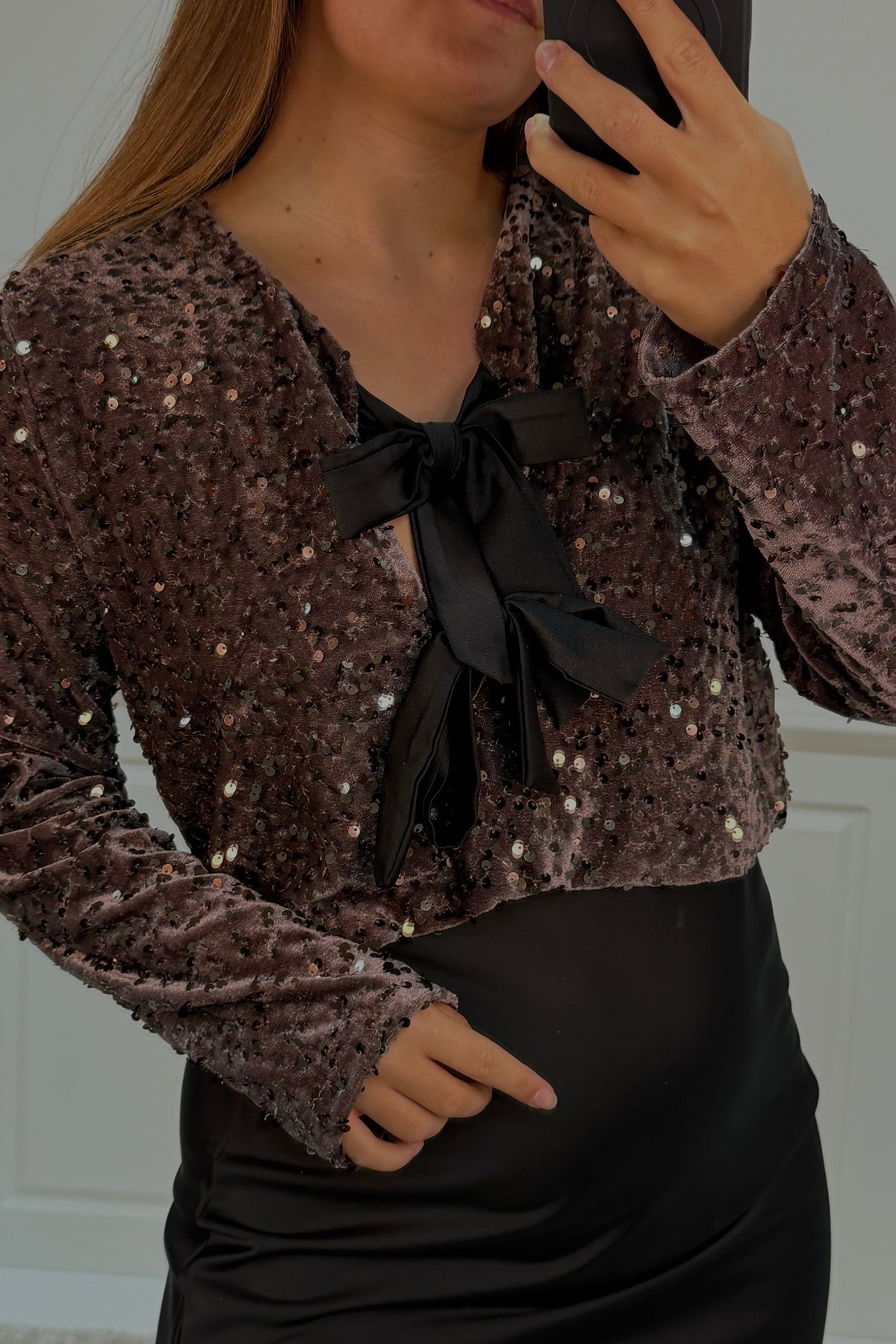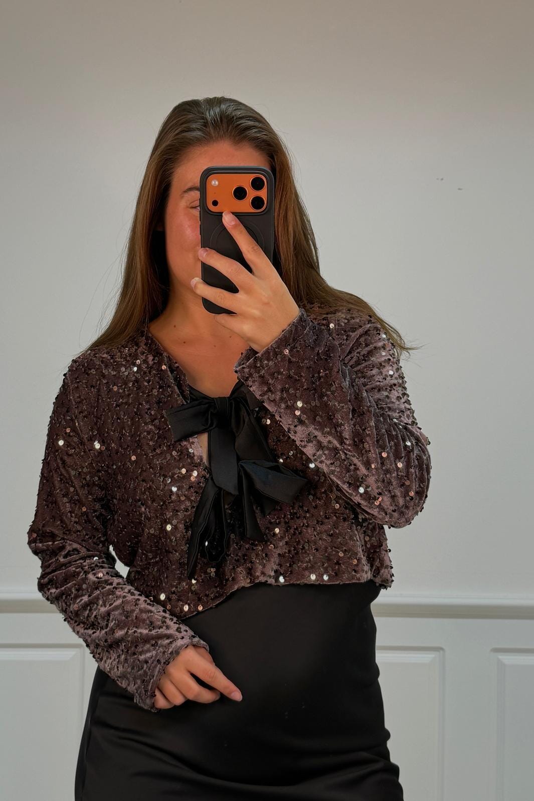 Feestblouse van A-bee in licht maroon met pailletten over de hele stof. Een V-hals met een zwarte strik en lange mouwen geven de blouse een feestelijke uitstraling.
