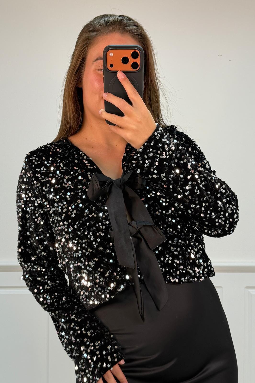 Zilverkleurige blouse van A-bee met pailletten over de hele blouse. V-hals met strikdetails en lange mouwen maken de blouse perfect voor feestelijke gelegenheden.