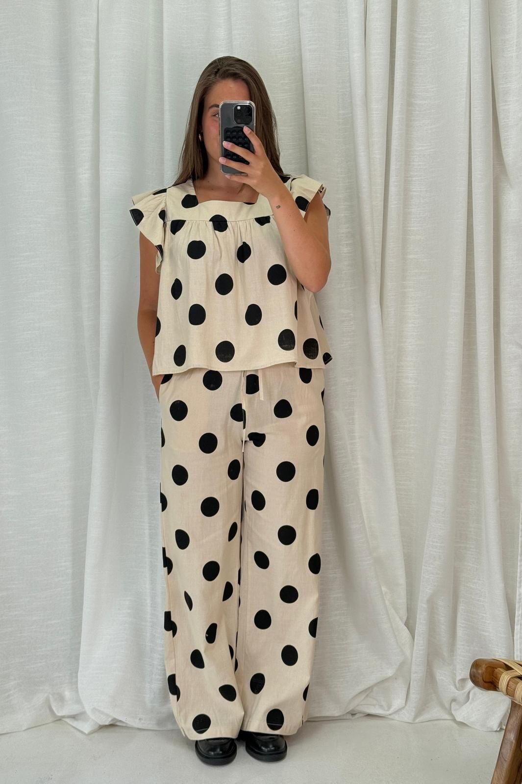 Broek van A-bee, gemaakt van een mix van katoen, viscose en linnen in een lichte ecru-tint. Deze broek heeft een gestippeld patroon met grote zwarte stippen.