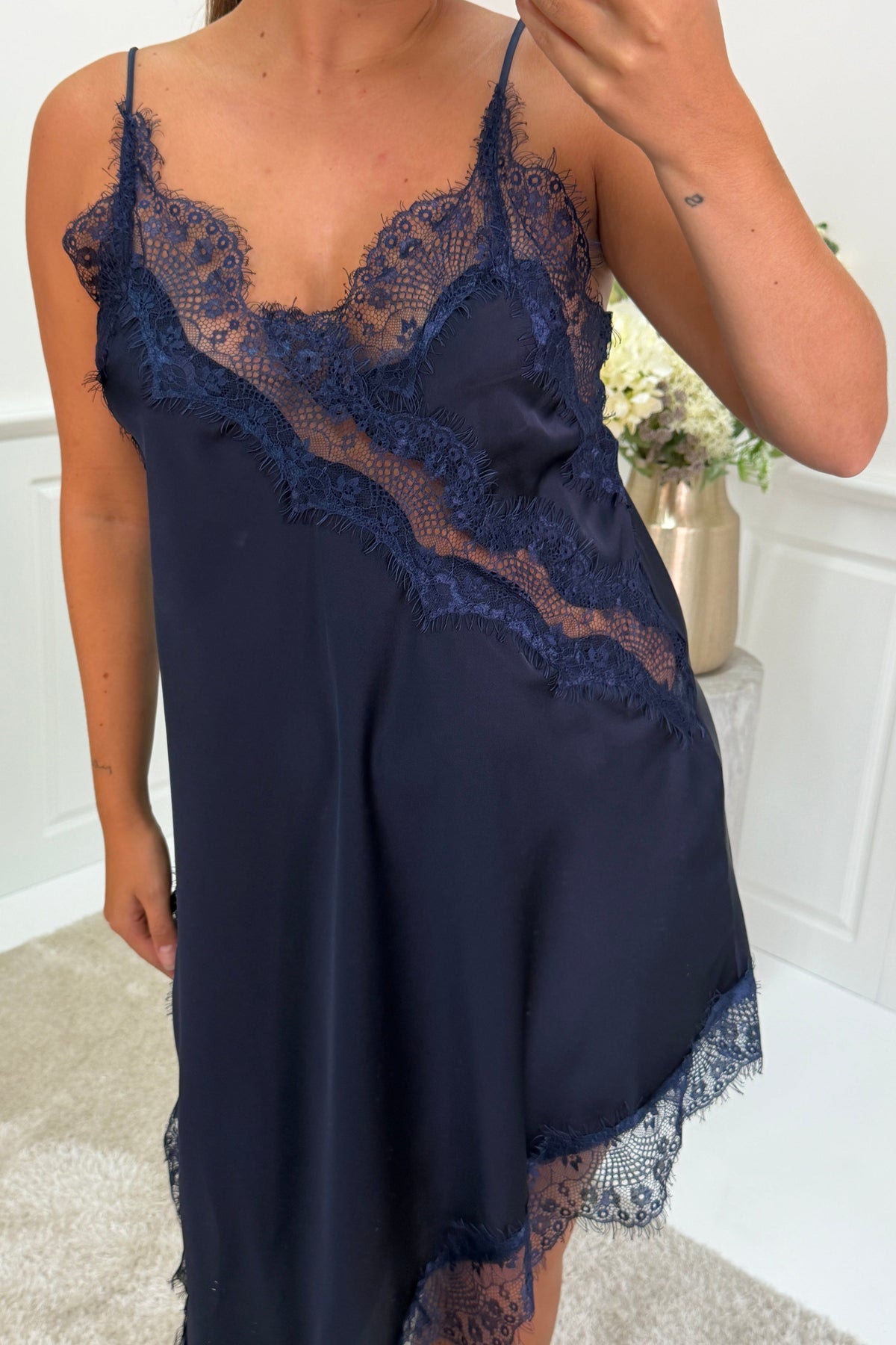 Donkerblauwe jurk van A-bee met een losse pasvorm en asymmetrische zoom. De jurk heeft kanten details bij de halslijn en langs de zoom, evenals dunne bandjes en een V-hals.