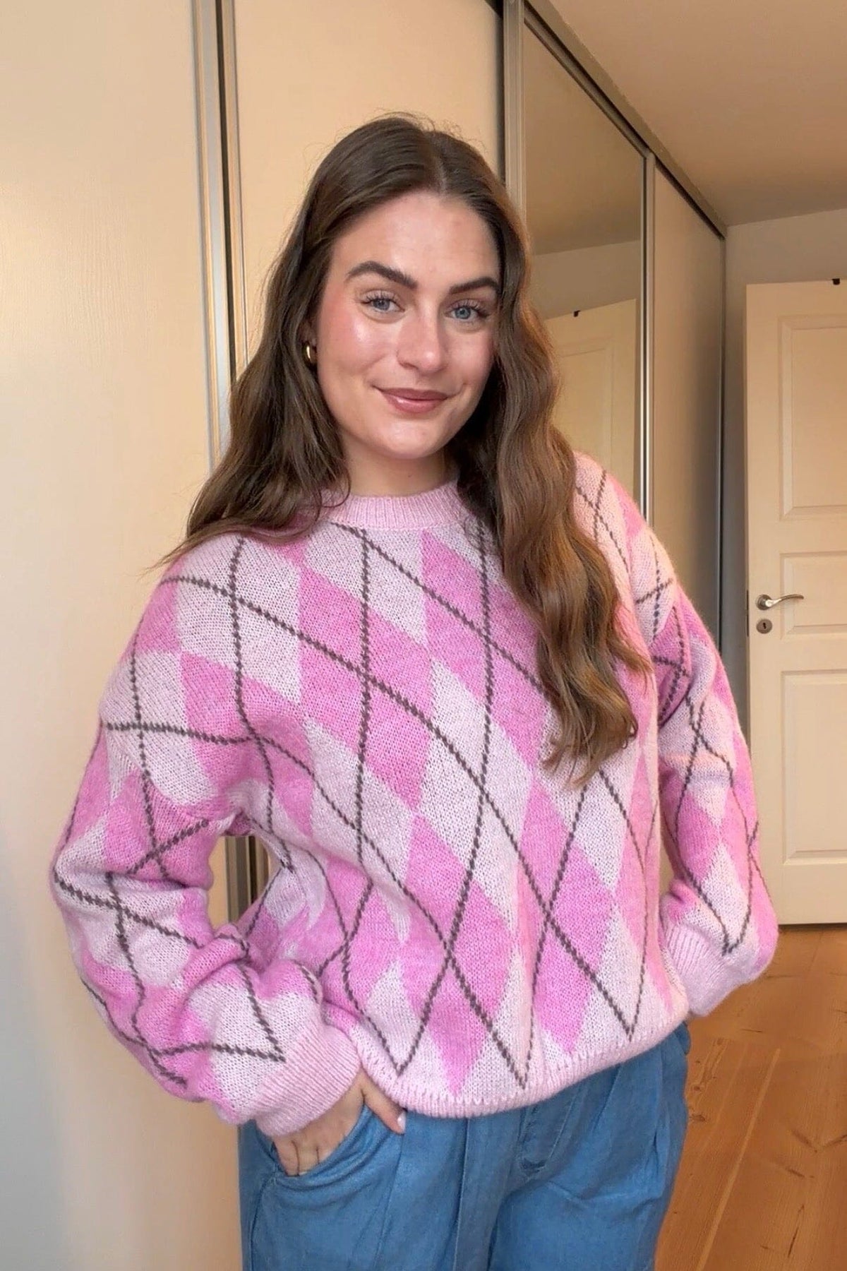 Gebreide trui van A-bee in roze en paarse tinten met een geruit argyle-patroon. De trui heeft een losse pasvorm en lange mouwen.