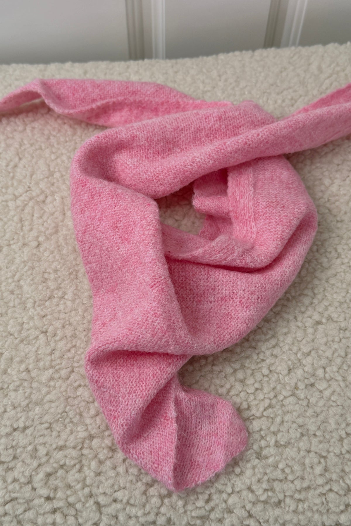 Roze sjaal van A-bee, gemaakt van 80% viscose en 20% wol. De sjaal heeft een zacht oppervlak en een gemêleerde structuur.