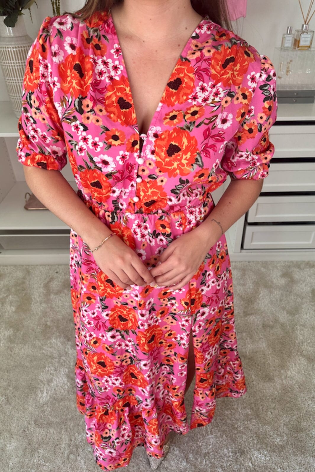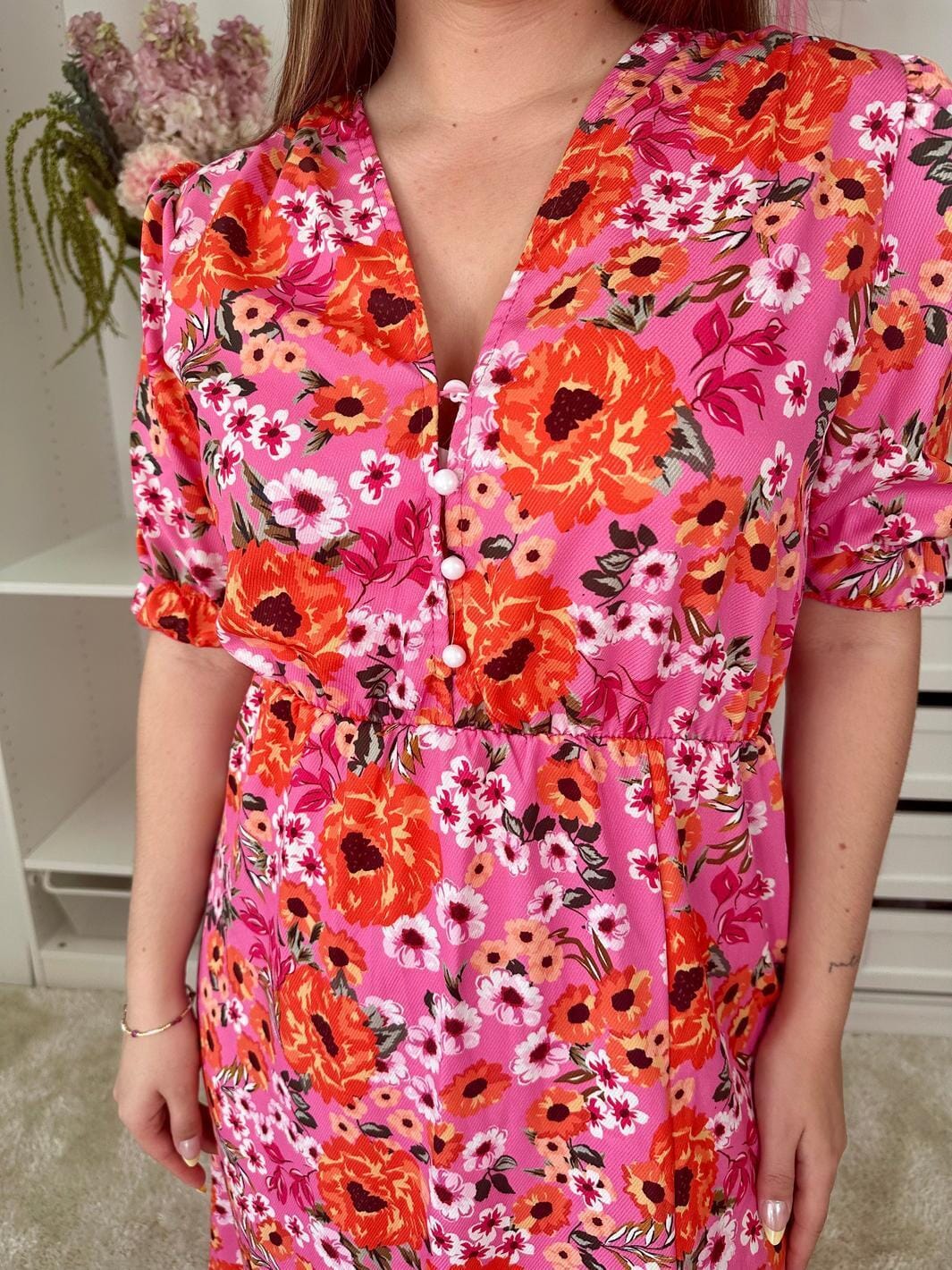 Enkel-lange jurk van A-bee met een bloemenprint in roze en oranje. De jurk heeft een V-hals met knopen aan de voorkant en een split aan de zijkant.