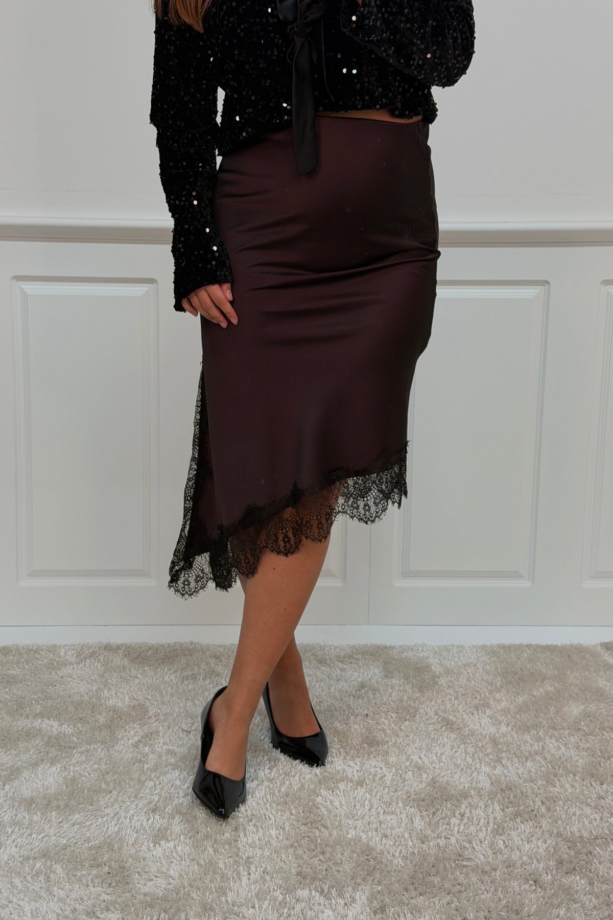 Bruine rok van A-bee met kanten details langs de rand. De rok is gemaakt van viscose en heeft een lengte tot de kuit met een normale taillehoogte.