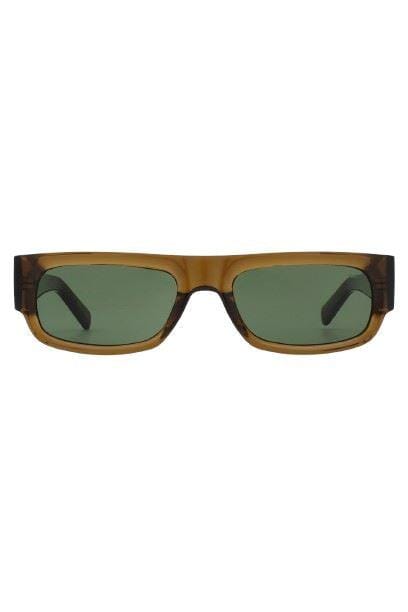 Zonnebrillen van A. Kjærbede in transparant bruin met groene lenzen. De brillen hebben een rechthoekige vorm en zijn gemaakt van het lichte materiaal Tritan Renew.