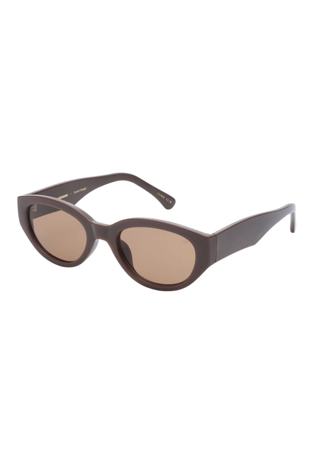 Bruine zonnebrillen van A. Kjærbede met een cat-eye vorm. Het montuur heeft een dik ontwerp in donkerbruin Tritan Renew-materiaal met buigbare poten en hoogwaardige optische scharnieren.