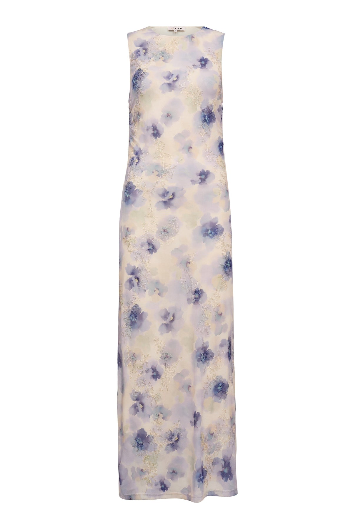Mouwloze jurk van A-View met een paars en geel bloemenprint. De jurk is gemaakt van meshkwaliteit en heeft een lengte tot net boven de knie.