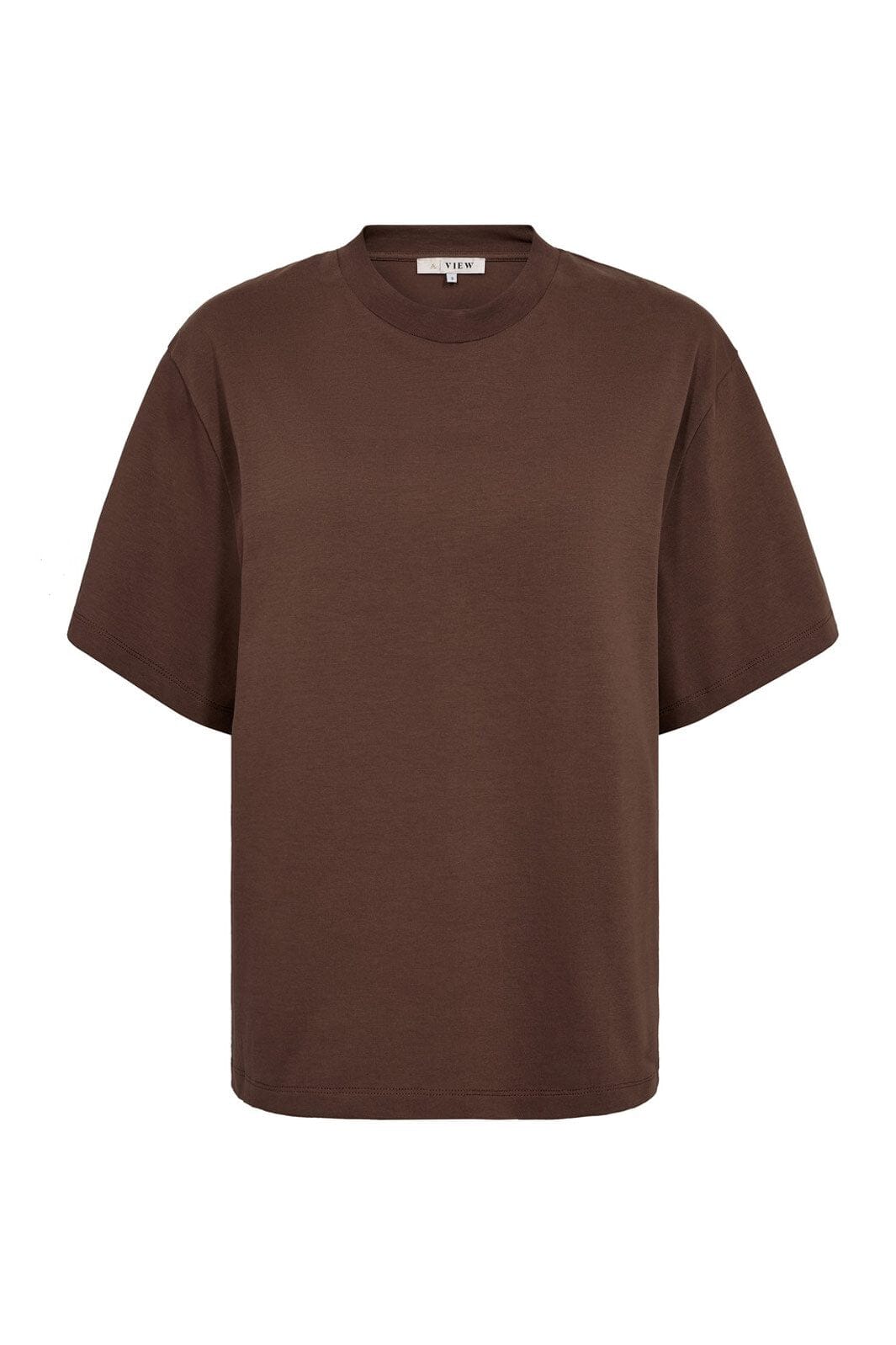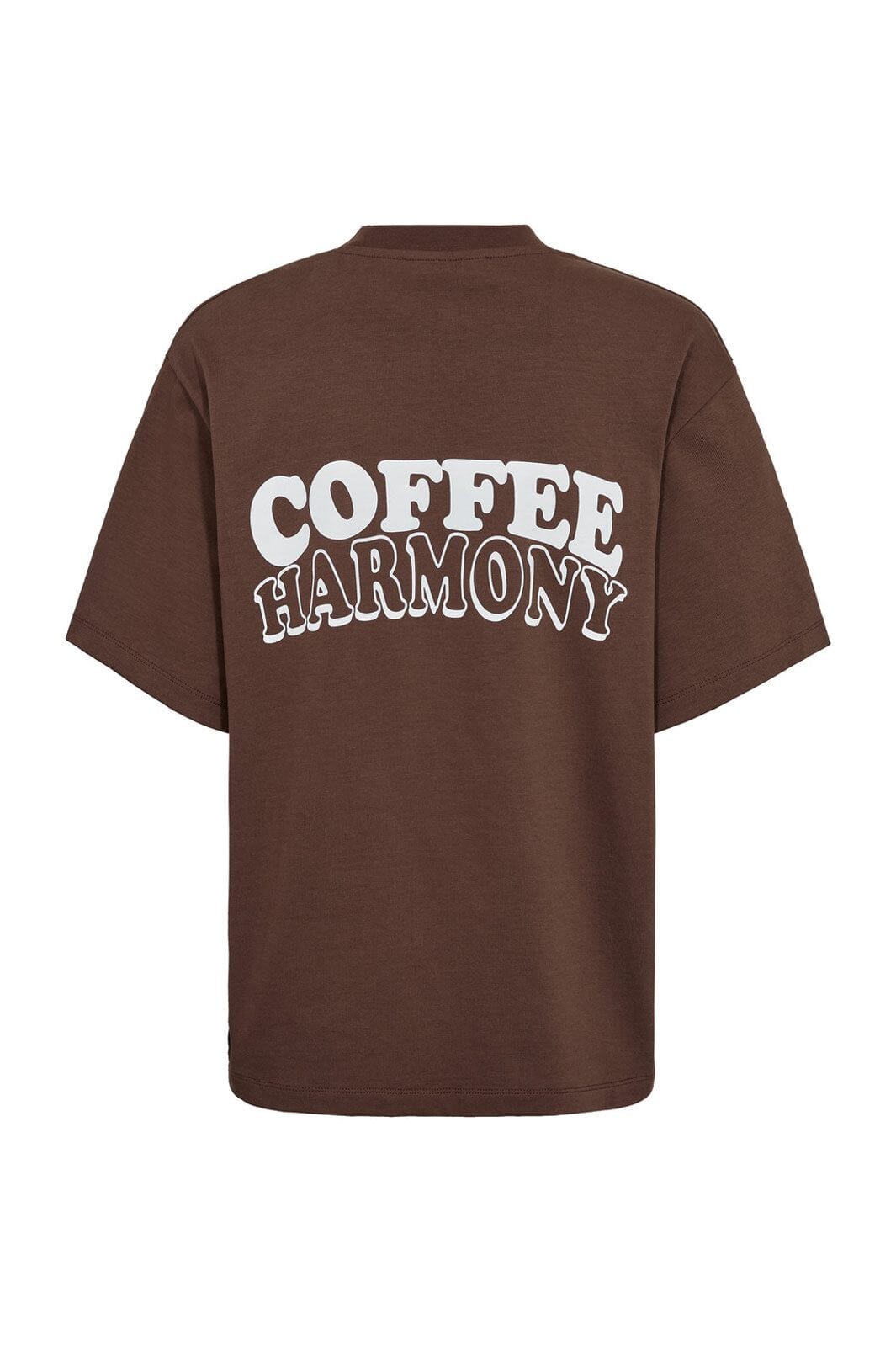 Bruin t-shirt van A-View met een grote COFFEE HARMONY-print op de rug. De t-shirt heeft een losse pasvorm en is gemaakt van biologisch katoen met een ronde hals.