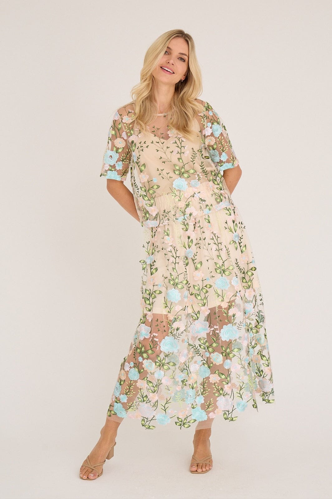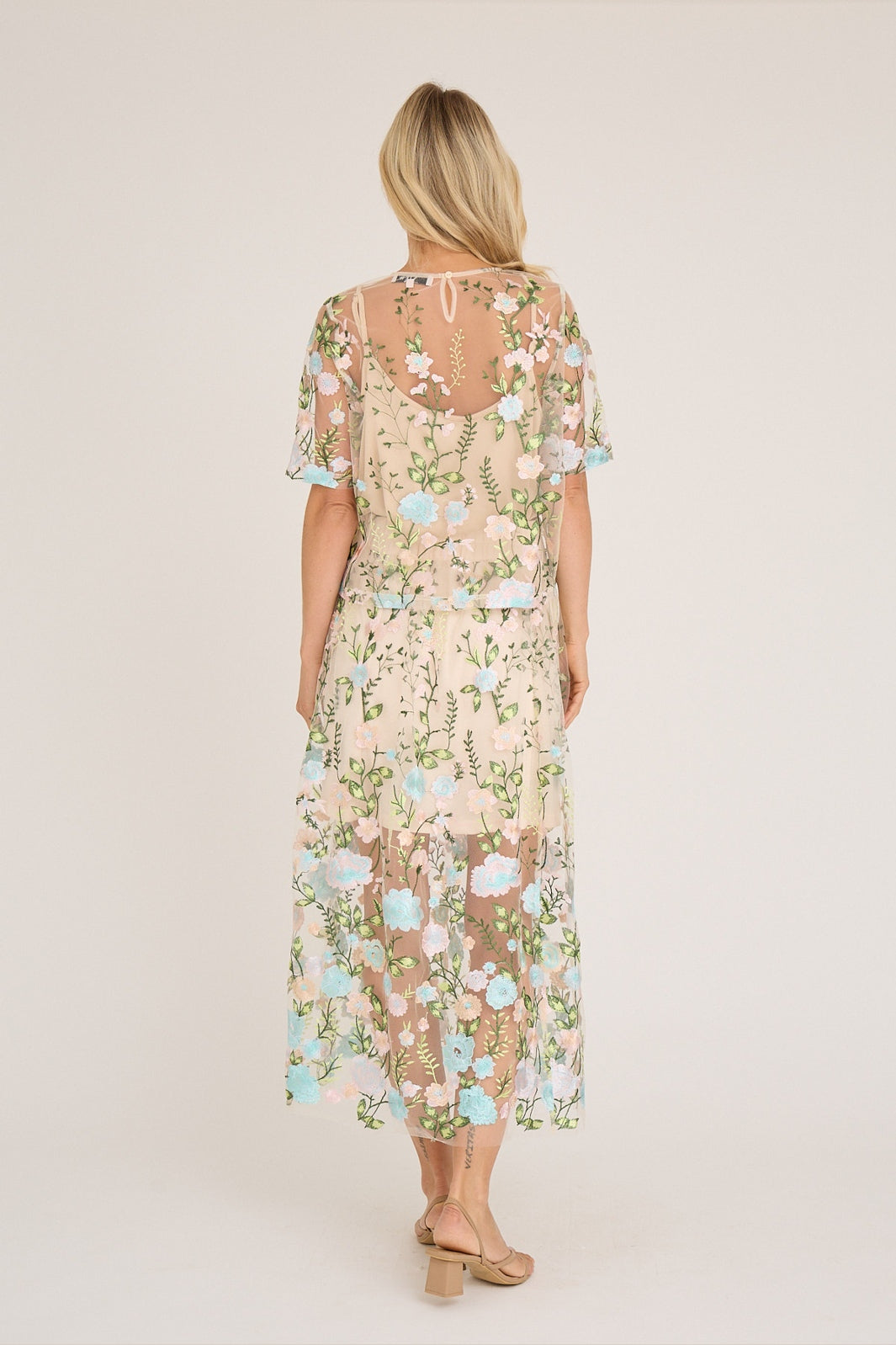 Blouse van A-View met transparant mesh en geborduurde bloemen in roze en blauwe tinten. Het meerkleurige patroon geeft de blouse een levendige uitstraling.
