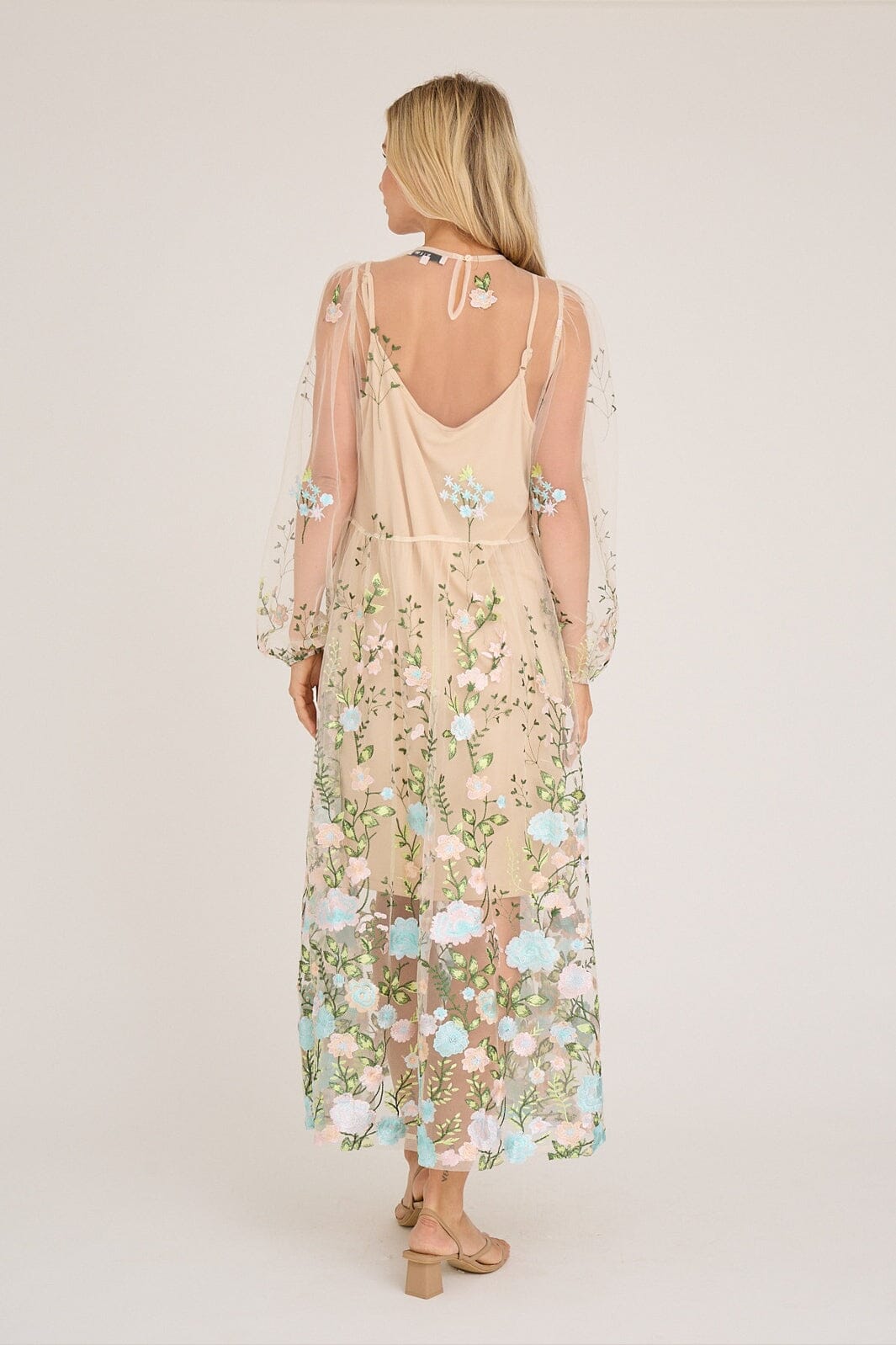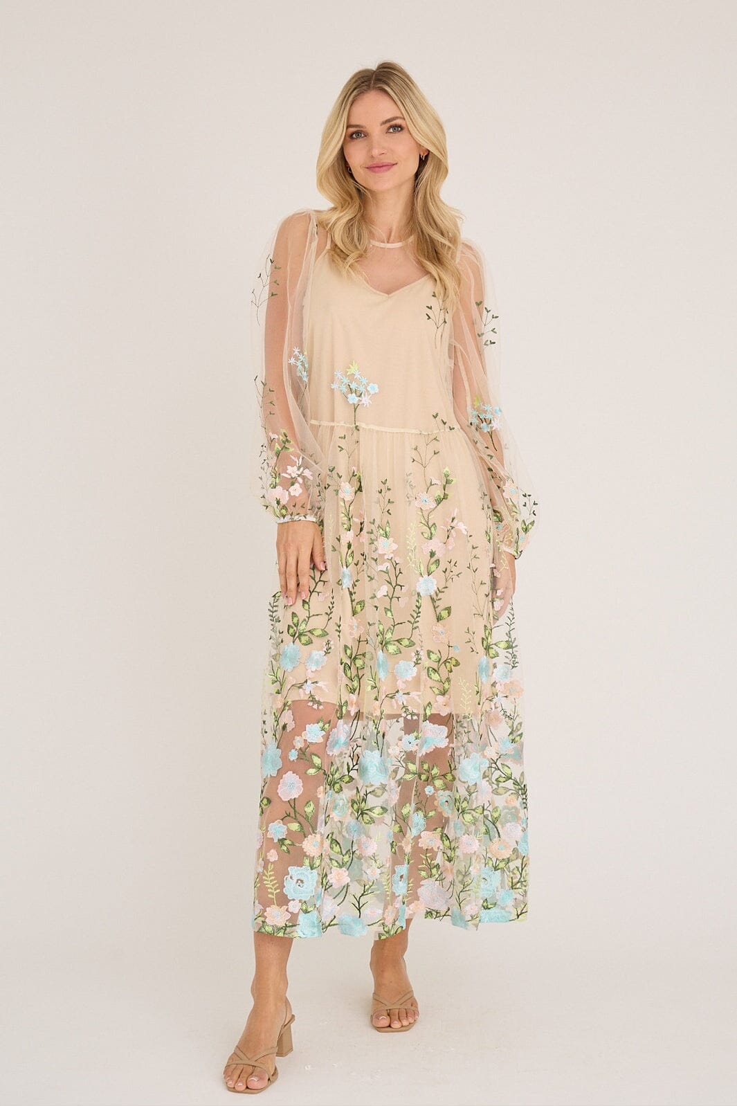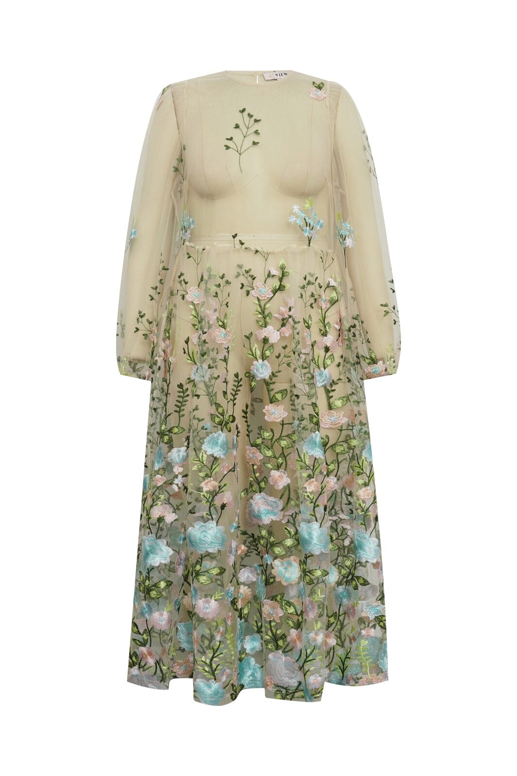 Jurk van A-View in transparant mesh met geborduurde bloemen in roze en blauwe tinten. De jurk heeft een losse pasvorm en reikt tot aan de enkels.
