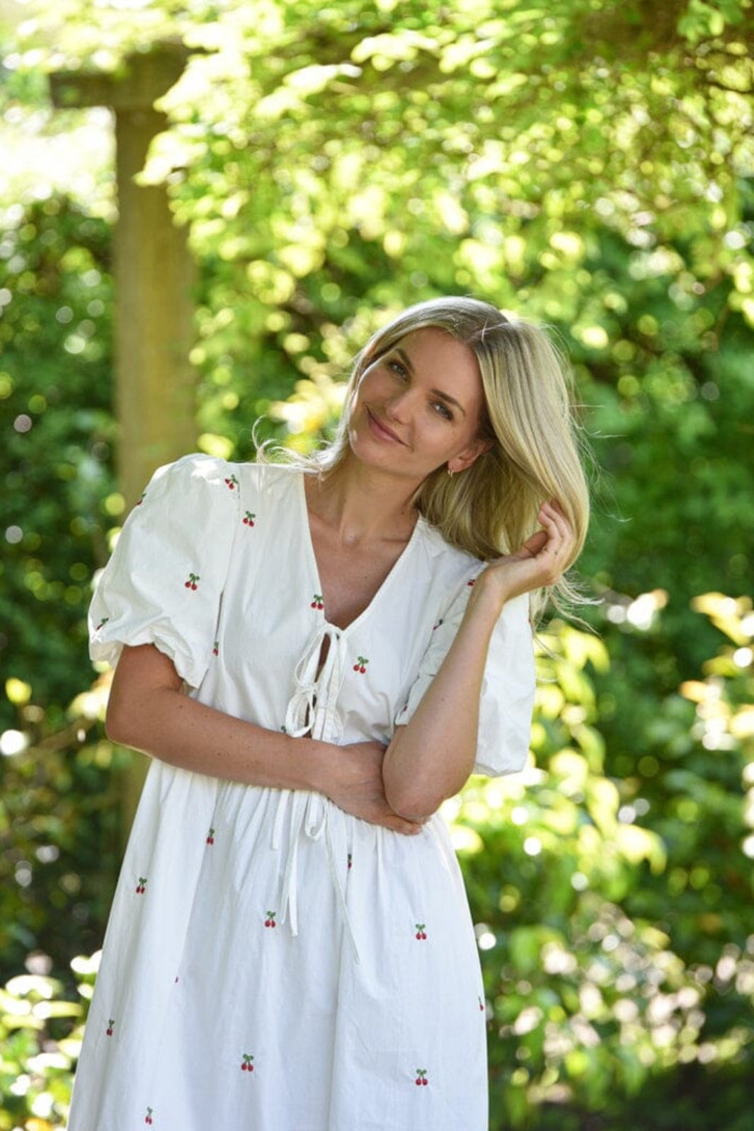 Witte jurk van A-View van 100% katoen. De jurk heeft korte pofmouwen, een V-hals met strik aan de voorkant en subtiele kersenborduursels over de hele jurk.