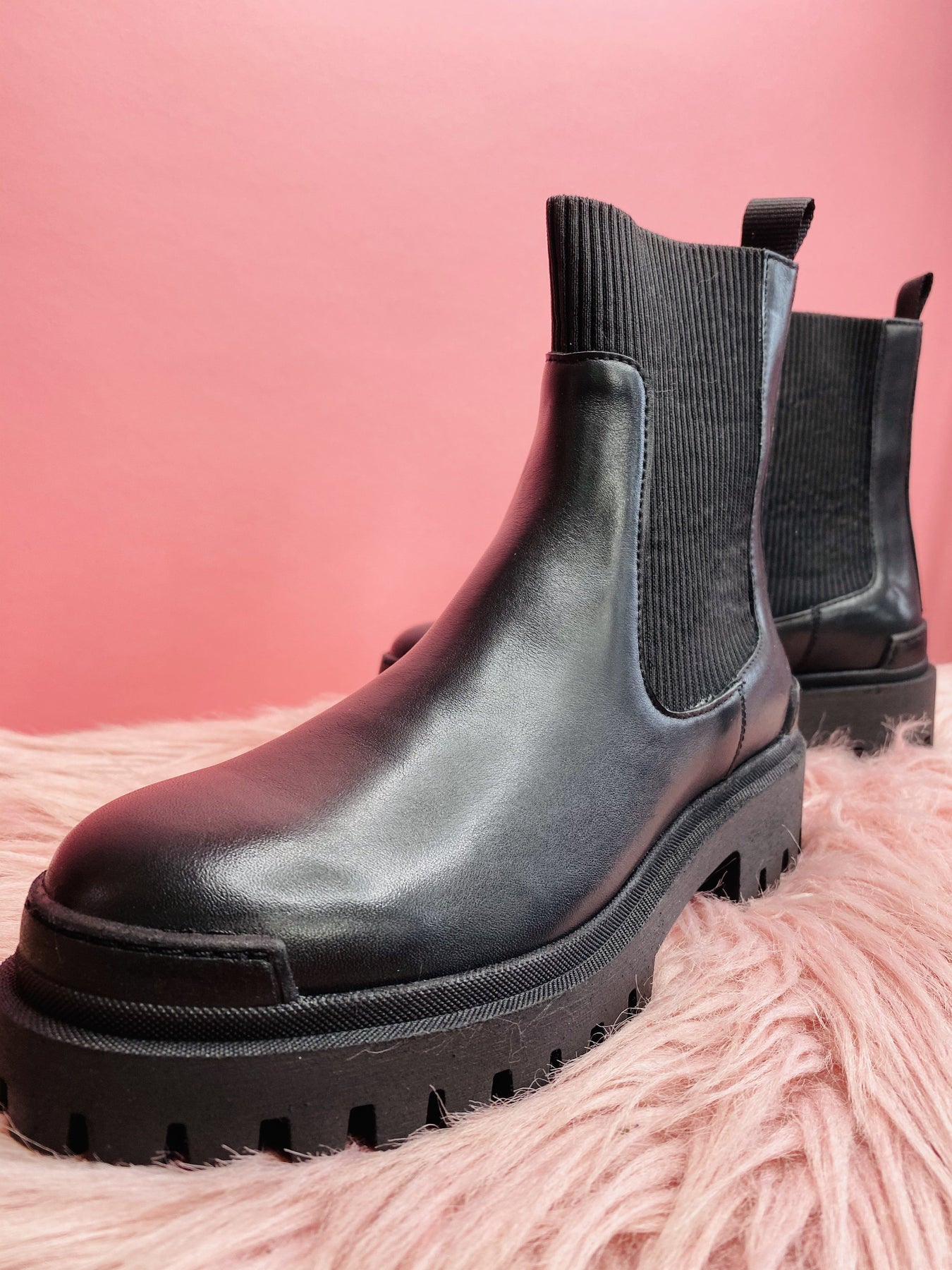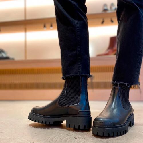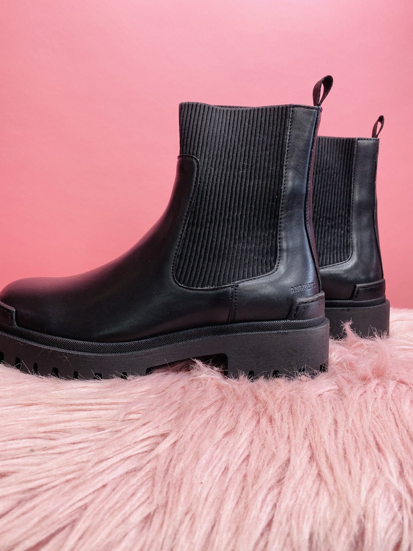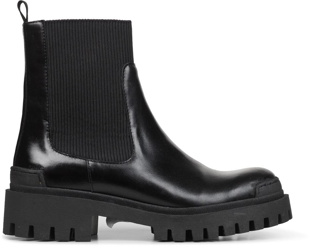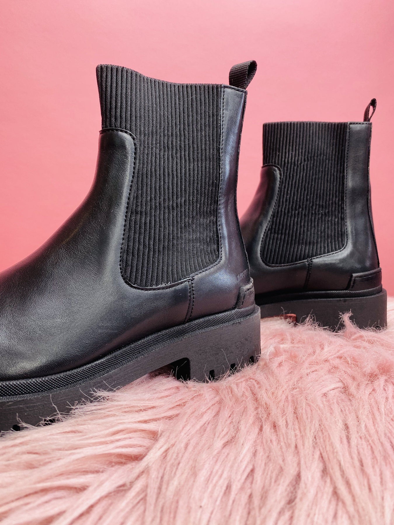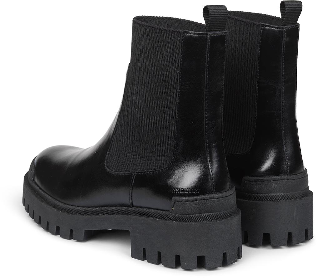 Fed ankel støvle fra Angulus i sort læder med indvendig glat skind foring. Støvlen har elastik i siderne samt øverst fortil. 4 cm tyk chunky bund og skafthøjde på 15 cm.