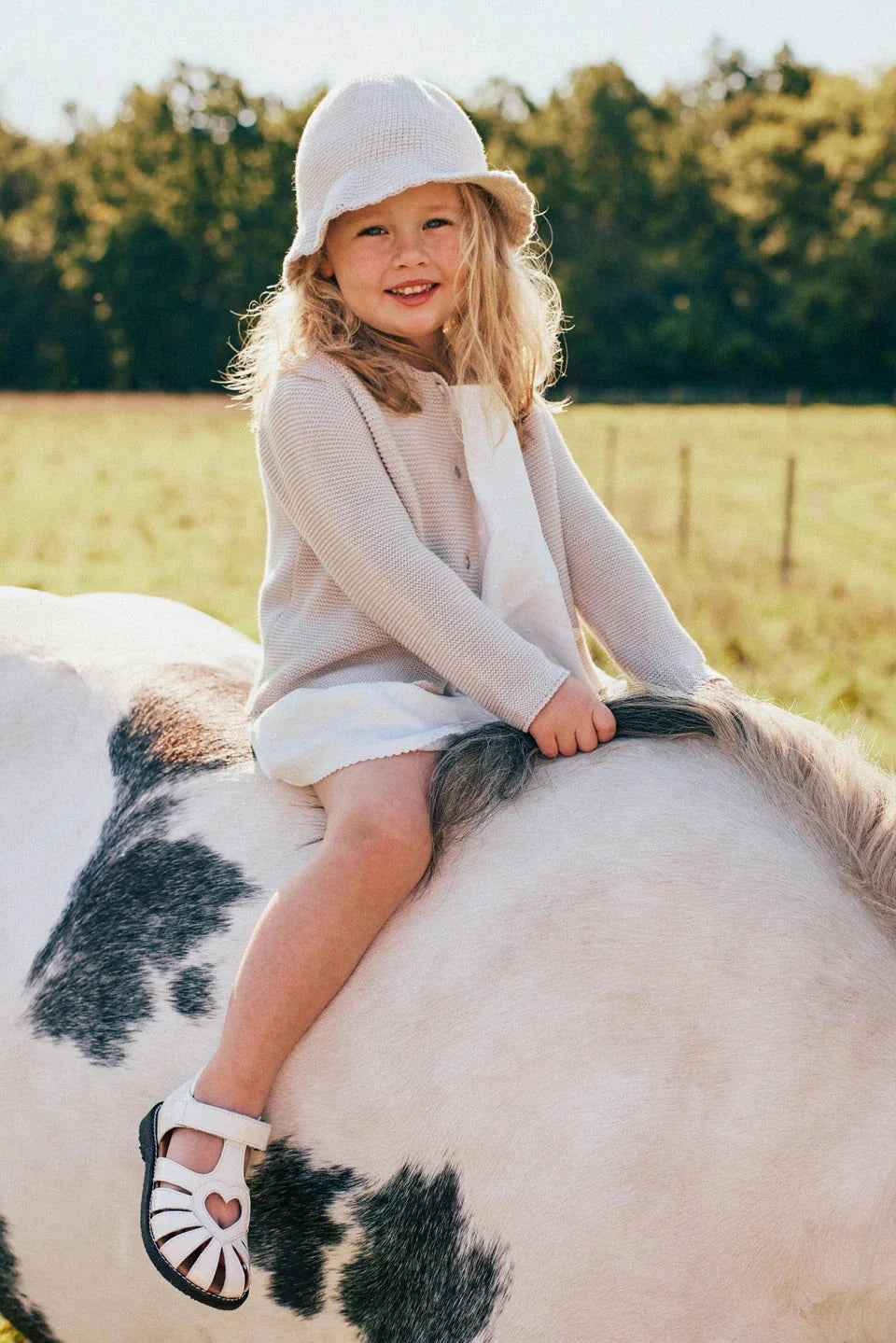 Sandaal van Angulus in een lichte crèmekleur. De sandaal is gemaakt van natuurlijk leer en heeft een hartvormige uitsnijding aan de bovenkant.