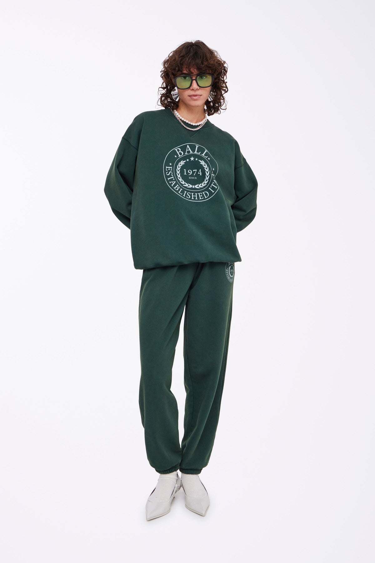 Donkergroene sweatshirt van Ball met grote grafische logo-print op de voorkant. De sweatshirt heeft een oversized pasvorm en een ronde halslijn met lange mouwen.
