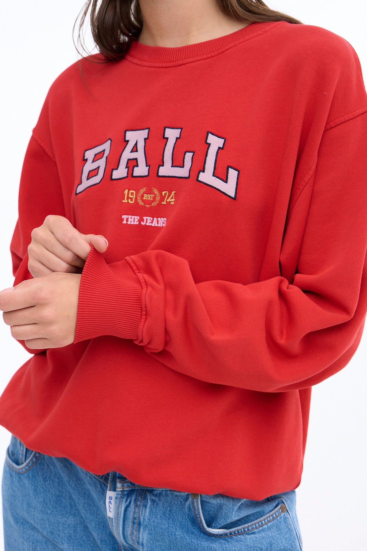 Rode sweatshirt van Ball met een losse pasvorm. Het sweatshirt heeft een geborduurd BALL-logo op de borst samen met het jaar 1974 en de tekst THE JEANS.