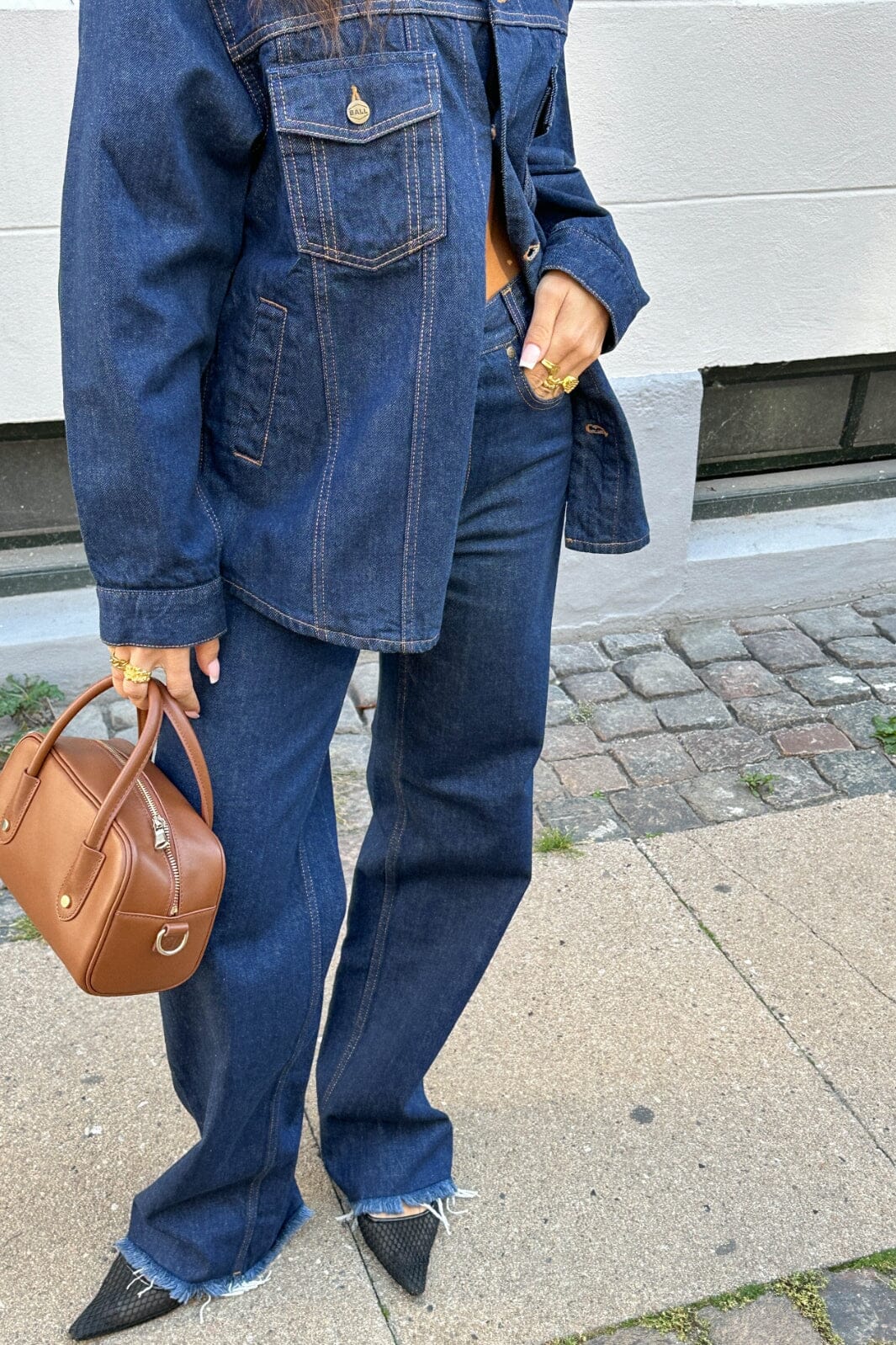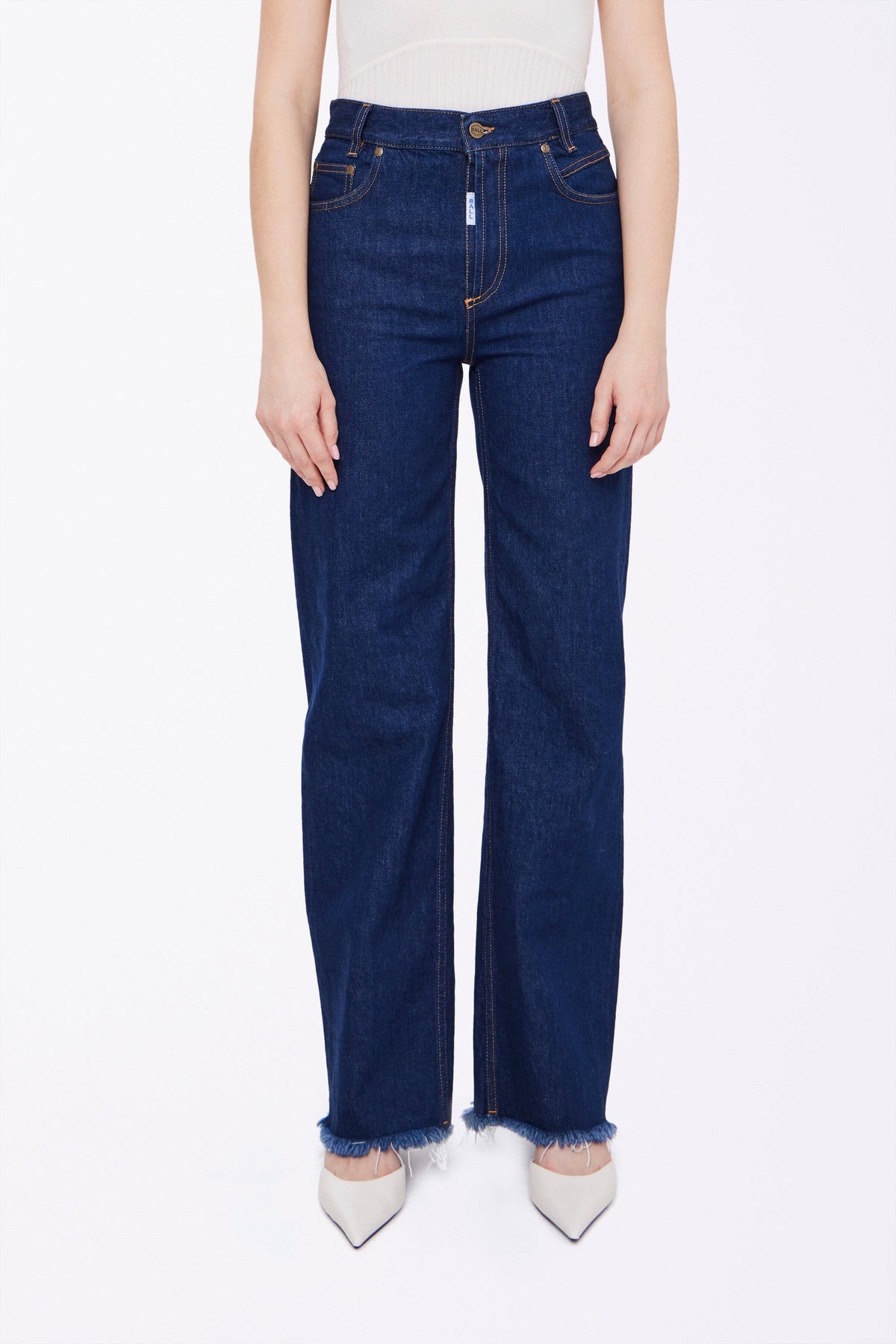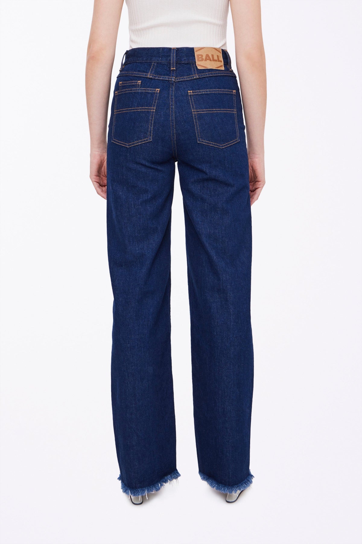 Jeans van Ball in donkerblauwe rinse wash. De broek heeft wijde benen met franjes aan de onderkant en decoratieve stiksels op de zakken.
