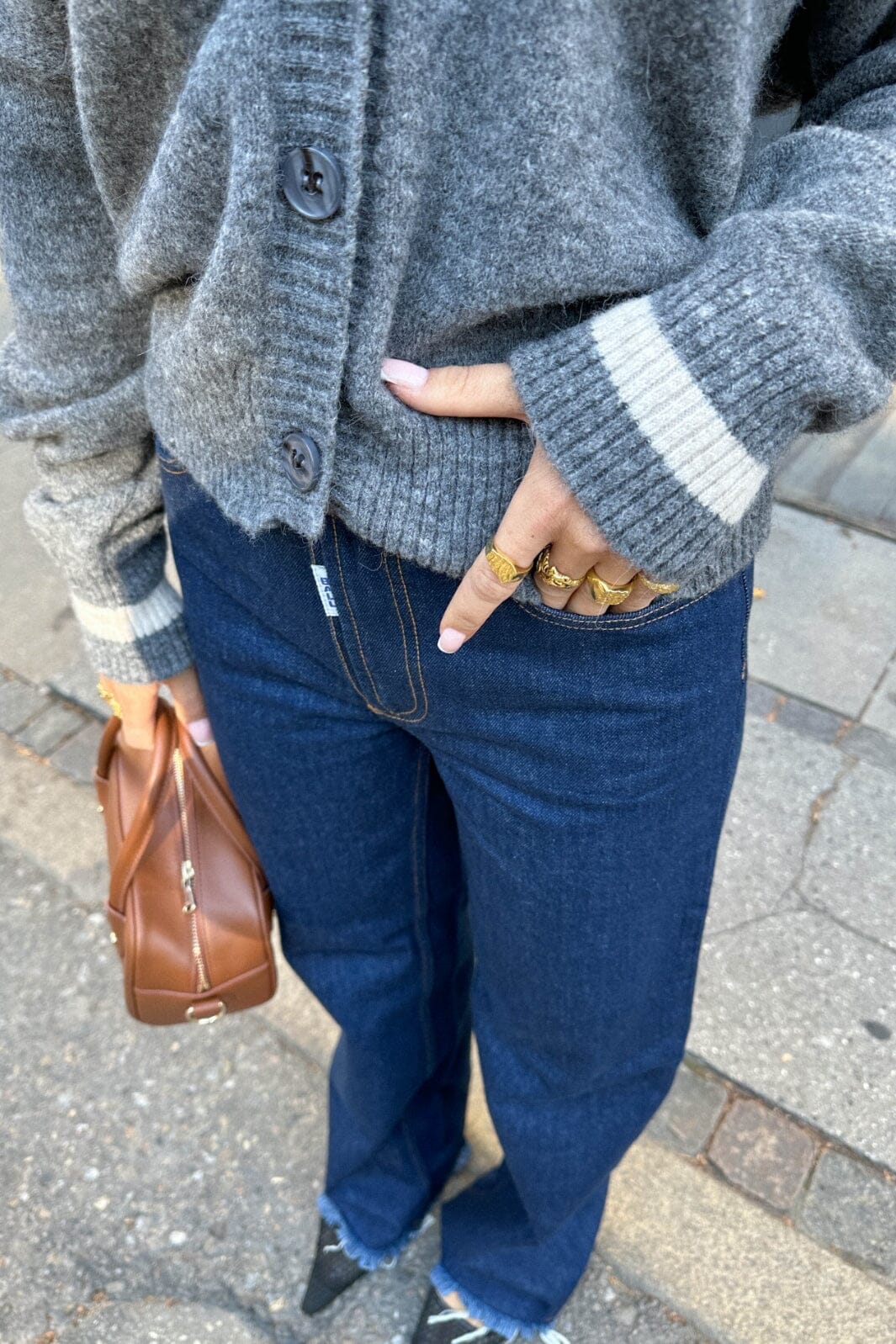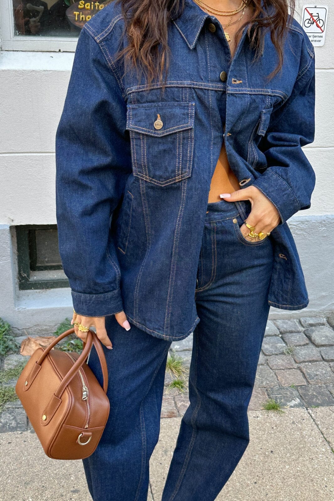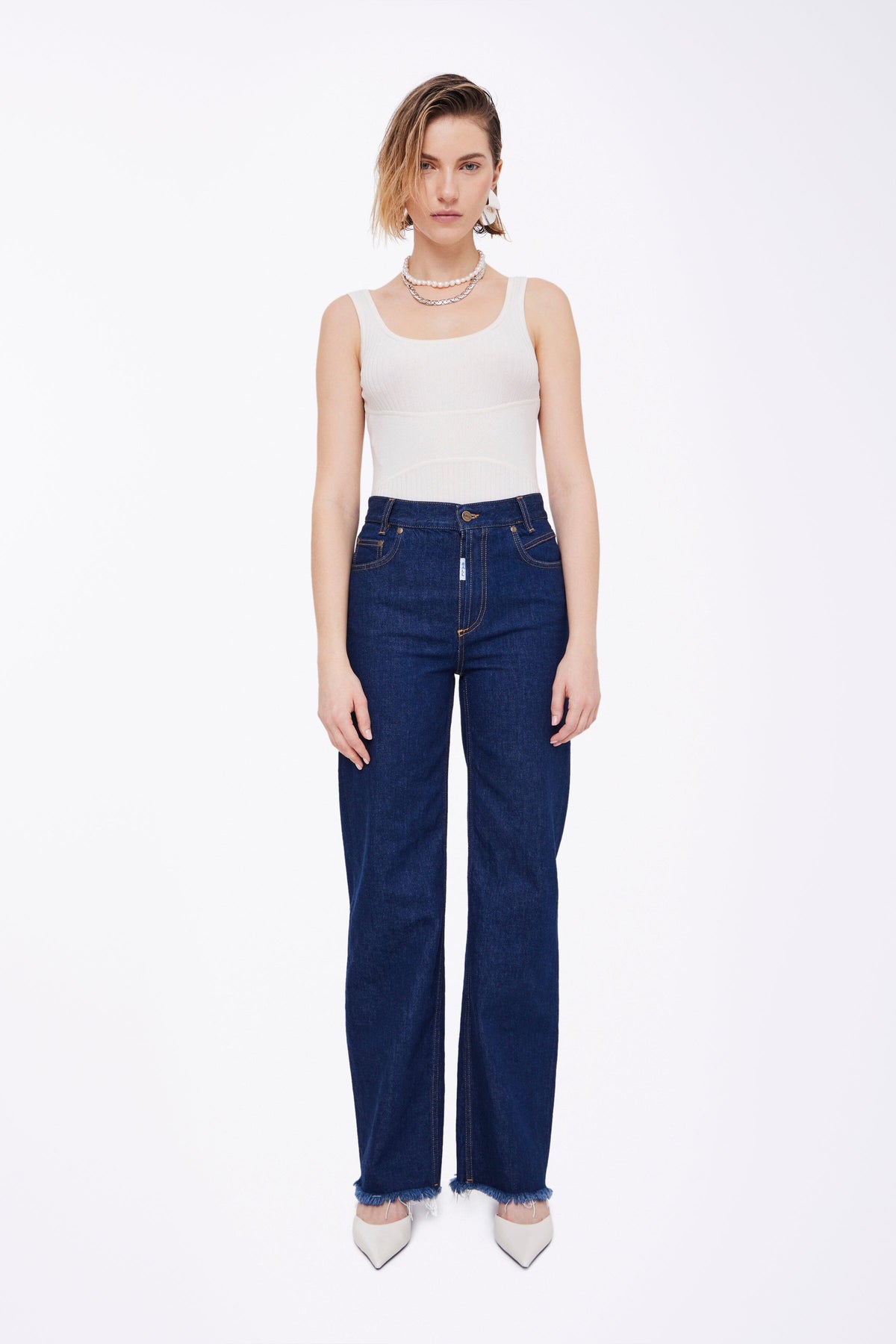 Jeans van Ball in donkerblauwe rinse wash. De broek heeft wijde benen met franjes aan de onderkant en decoratieve stiksels op de zakken.