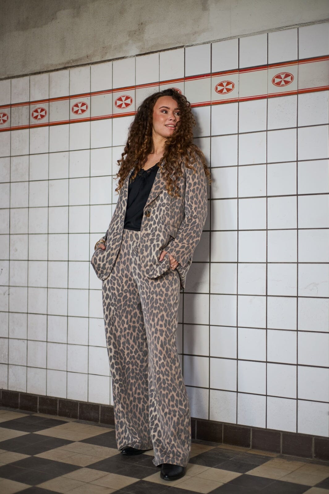 Blazer van Black Colour met dierenprint in bruin en beige tinten. Hij heeft een enkelvoudige knoopsluiting, een v-hals en 3/4 mouwen. Twee voorzakken geven de blazer een praktische uitstraling.