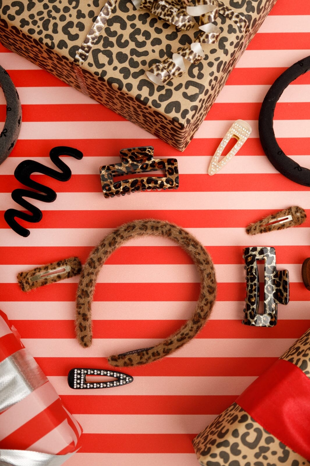 Haarclips van Black Colour met bruin luipaardpatroon en zachte oppervlakte. De set bestaat uit twee clips met metalen sluitingen die het haar de hele dag op zijn plaats houden.