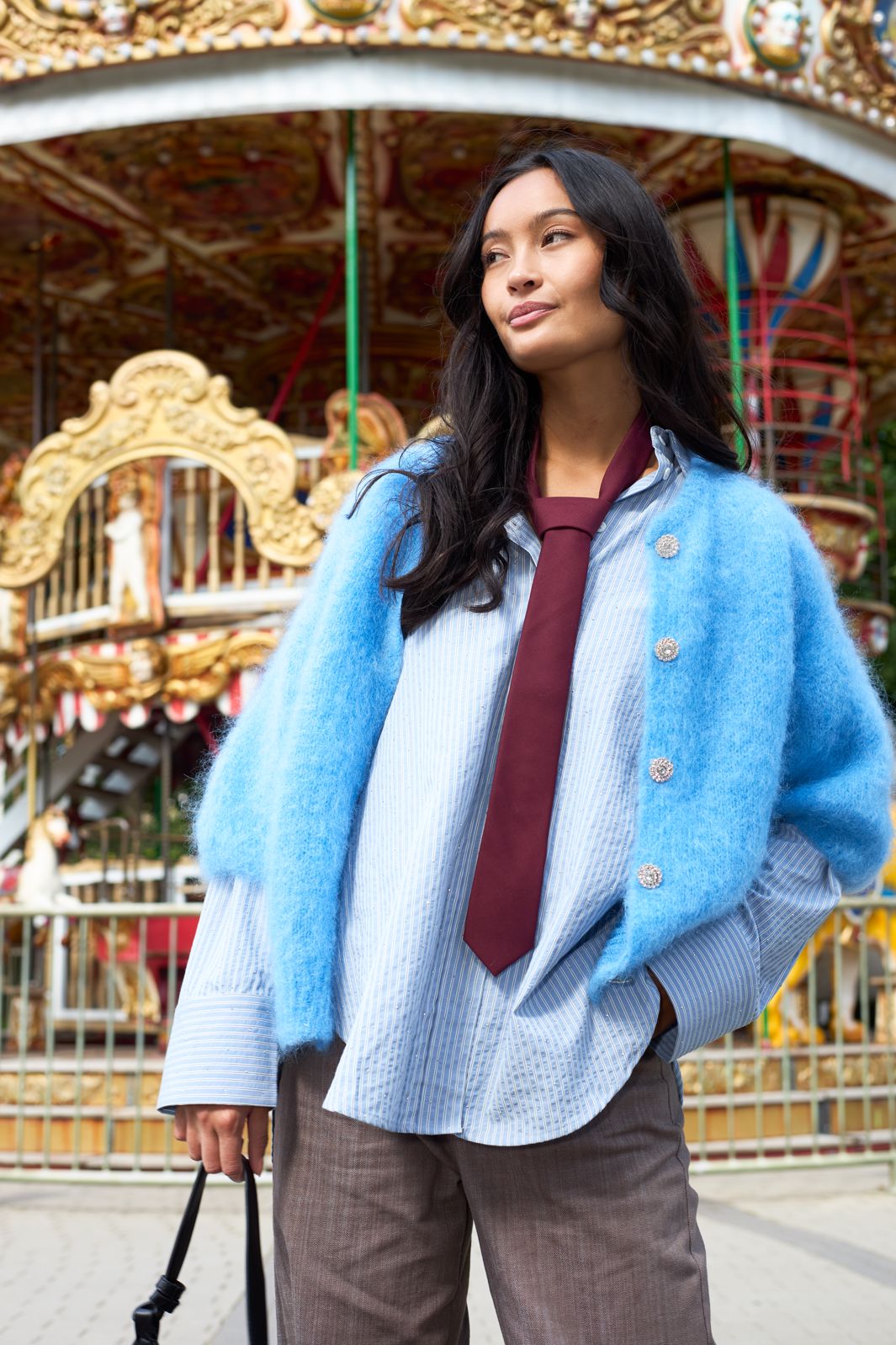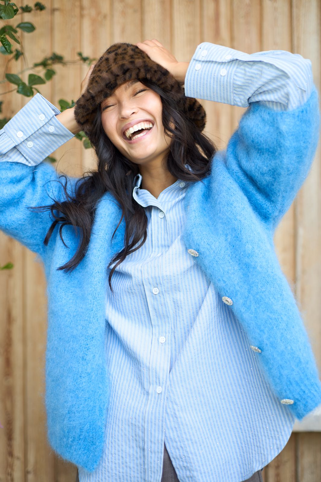 Gebreid vest van Black Colour in lichtblauw. Het zachte mohair-vest heeft een losse pasvorm met 3/4-mouwen en een knoopsluiting aan de voorkant met decoratieve knopen.