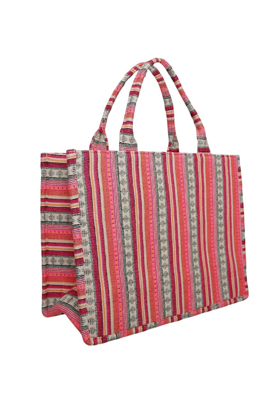 Gestreepte tas van Black Colour met een kenmerkend patroon in koraalachtige tinten en wit. De tas heeft een zomerse uitstraling met strepen in verschillende breedtes en kleuren.