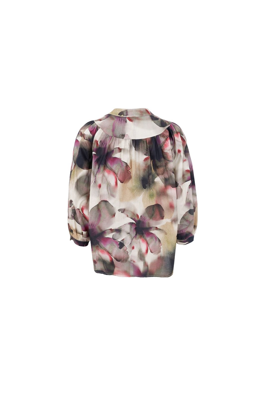 Blouse van Black Colour met bloemenprint in grijze, paarse en crèmekleurige tinten. Hij heeft een losse pasvorm met een overhemdkraag en 3/4-mouwen.