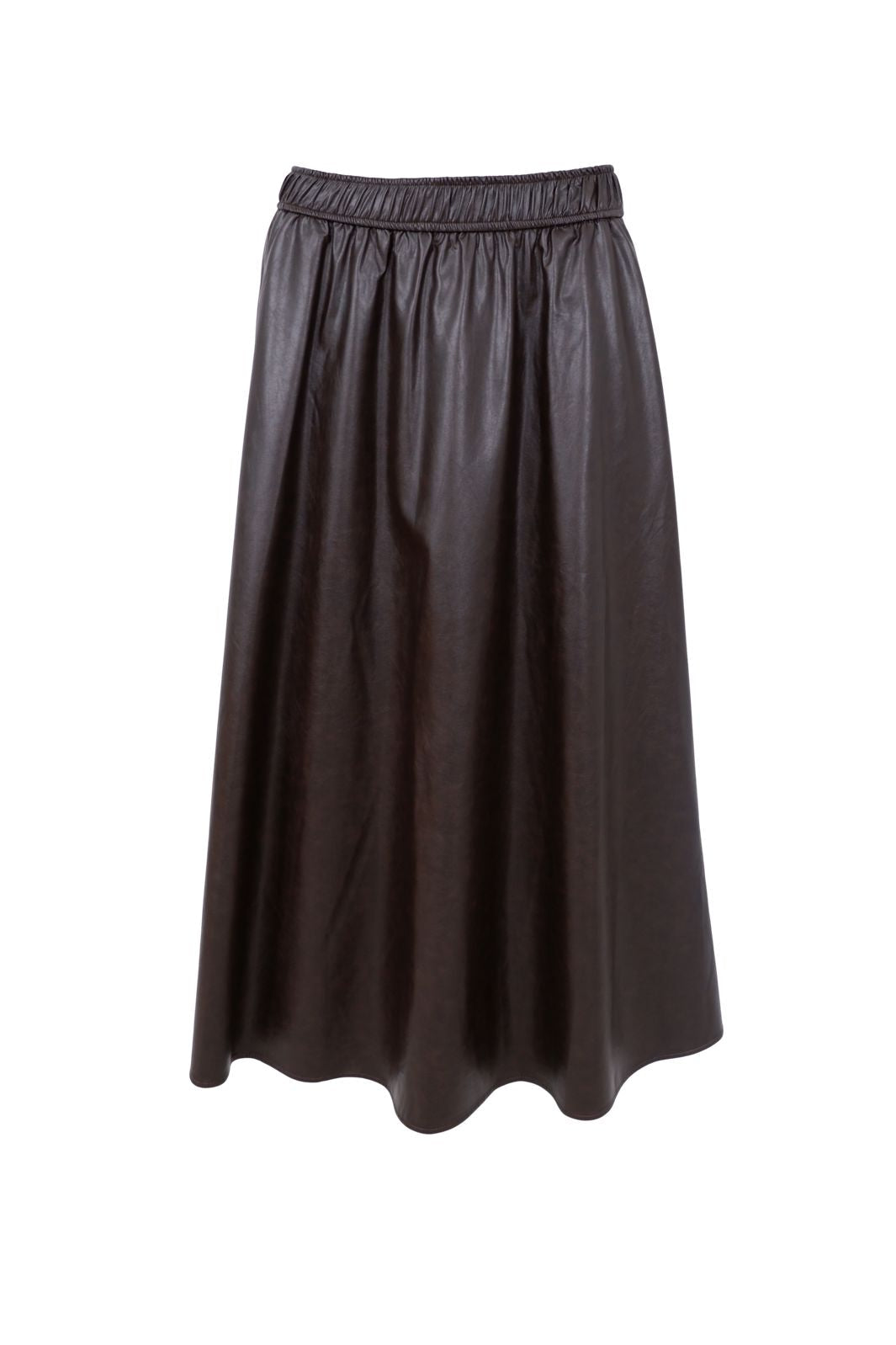 Bruine rok van Black Colour met een glanzend oppervlak. De rok heeft een hoge taille en een losse pasvorm die tot halverwege de kuit reikt.