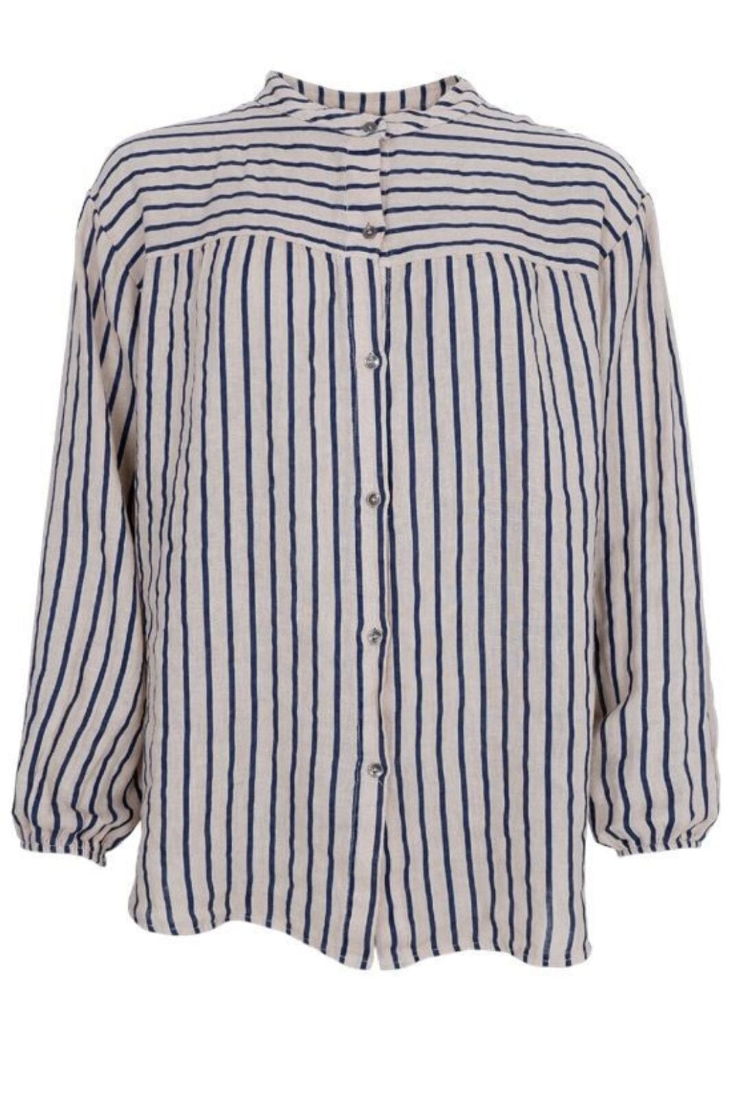Shirt van Black Colour in 100% linnen met marineblauwe strepen. Het heeft een overhemdkraag, knoopsluiting aan de voorkant en ruchesdetails die een lichte en luchtige uitstraling geven.
