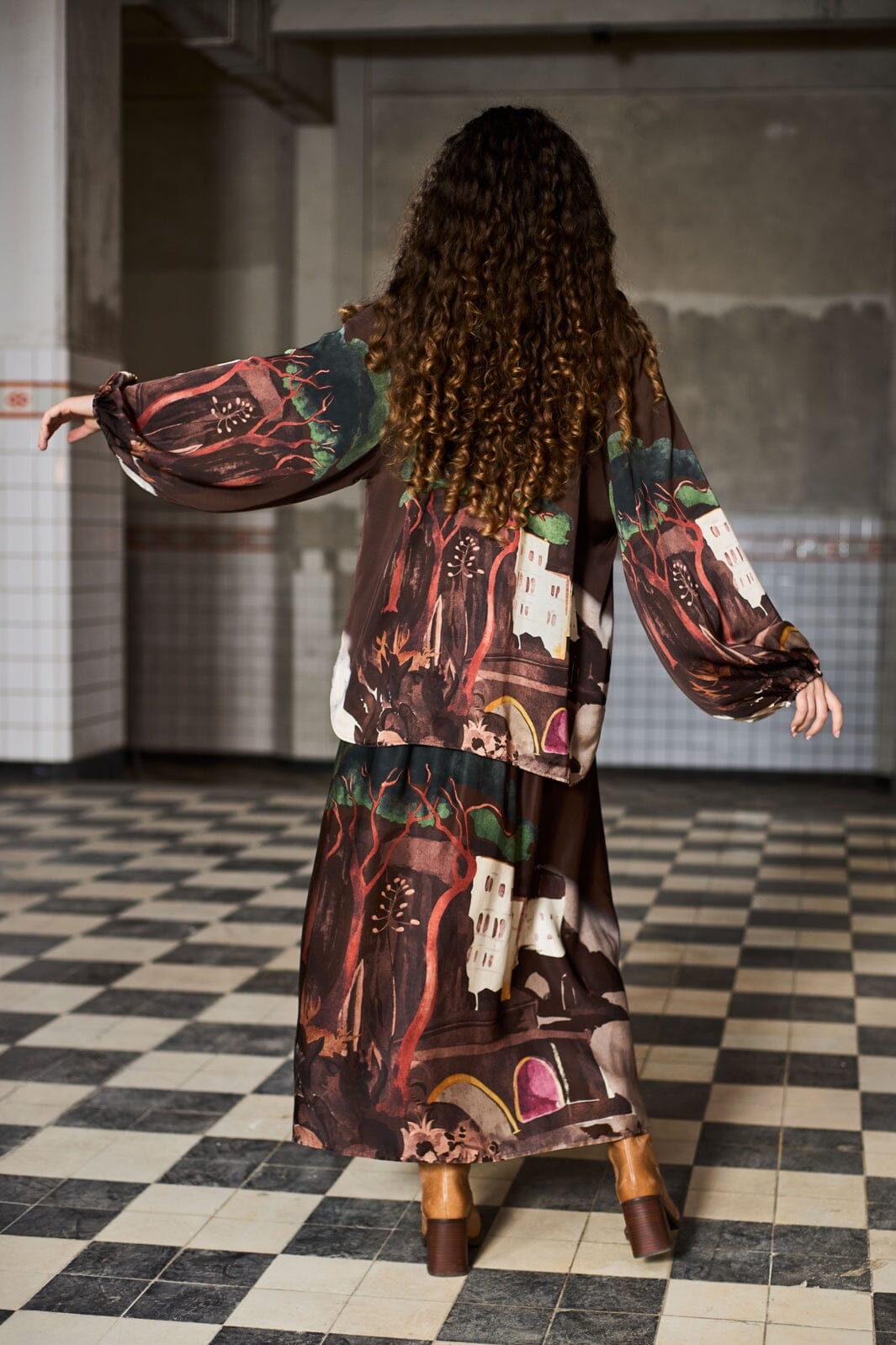 Rok van Black Colour in koffiebruin viscose met een artistieke print van bomen en gebouwen. Het heeft een hoge taille en een losse pasvorm die tot halverwege de kuit komt.