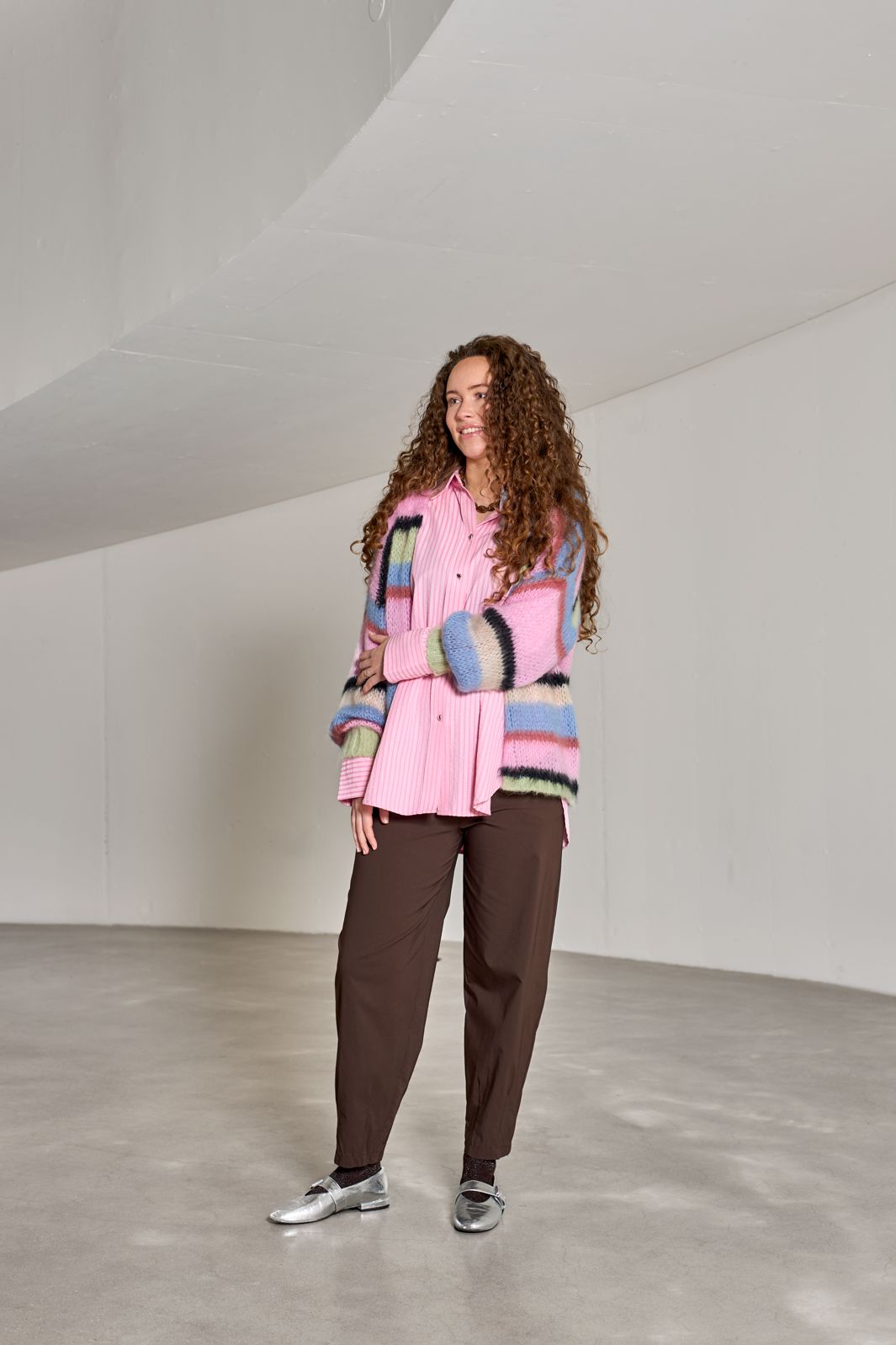 Roze blouse van Black Colour met verticale strepen. De blouse heeft een klassieke kraag, lange mouwen met manchetten en een knoopsluiting.