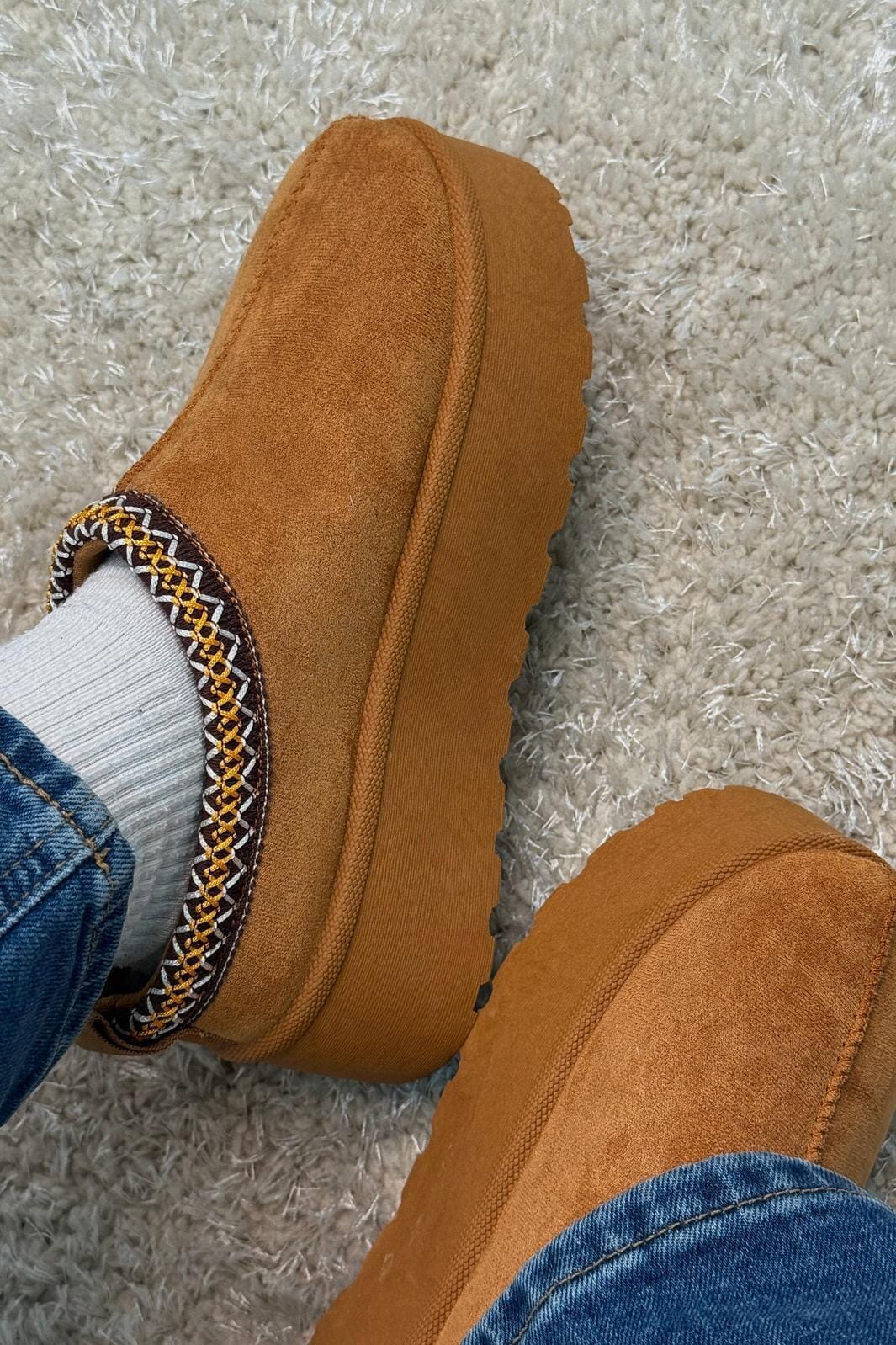 Pantoffels van Bloom met sleehak in een warme bruine tint. Gemaakt van 100% synthetisch materiaal met een ronde neus.