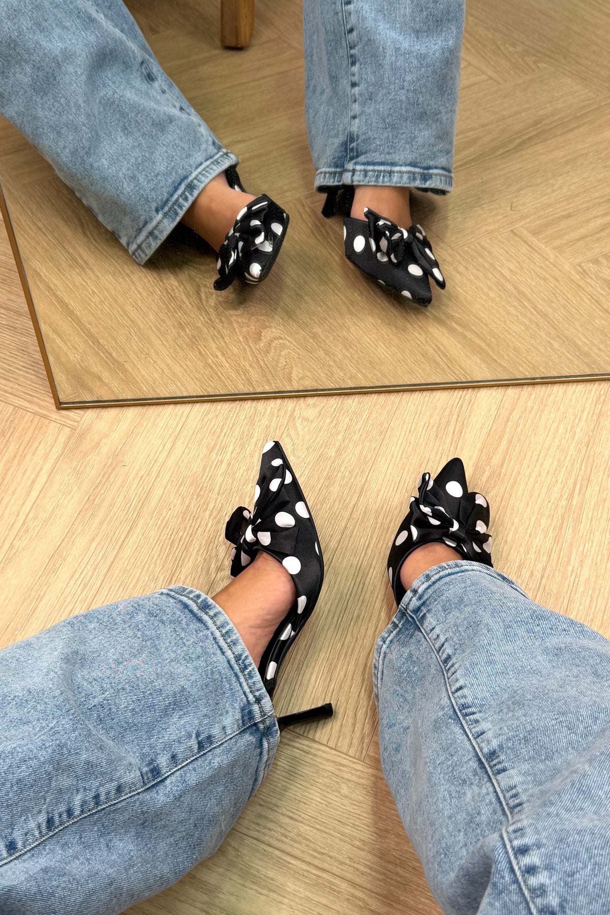 Zwarte stiletto's van Bloom met witte polkadots en een decoratieve strik aan de voorkant. De spitse neus en de stilettohak geven de schoen een klassieke uitstraling.