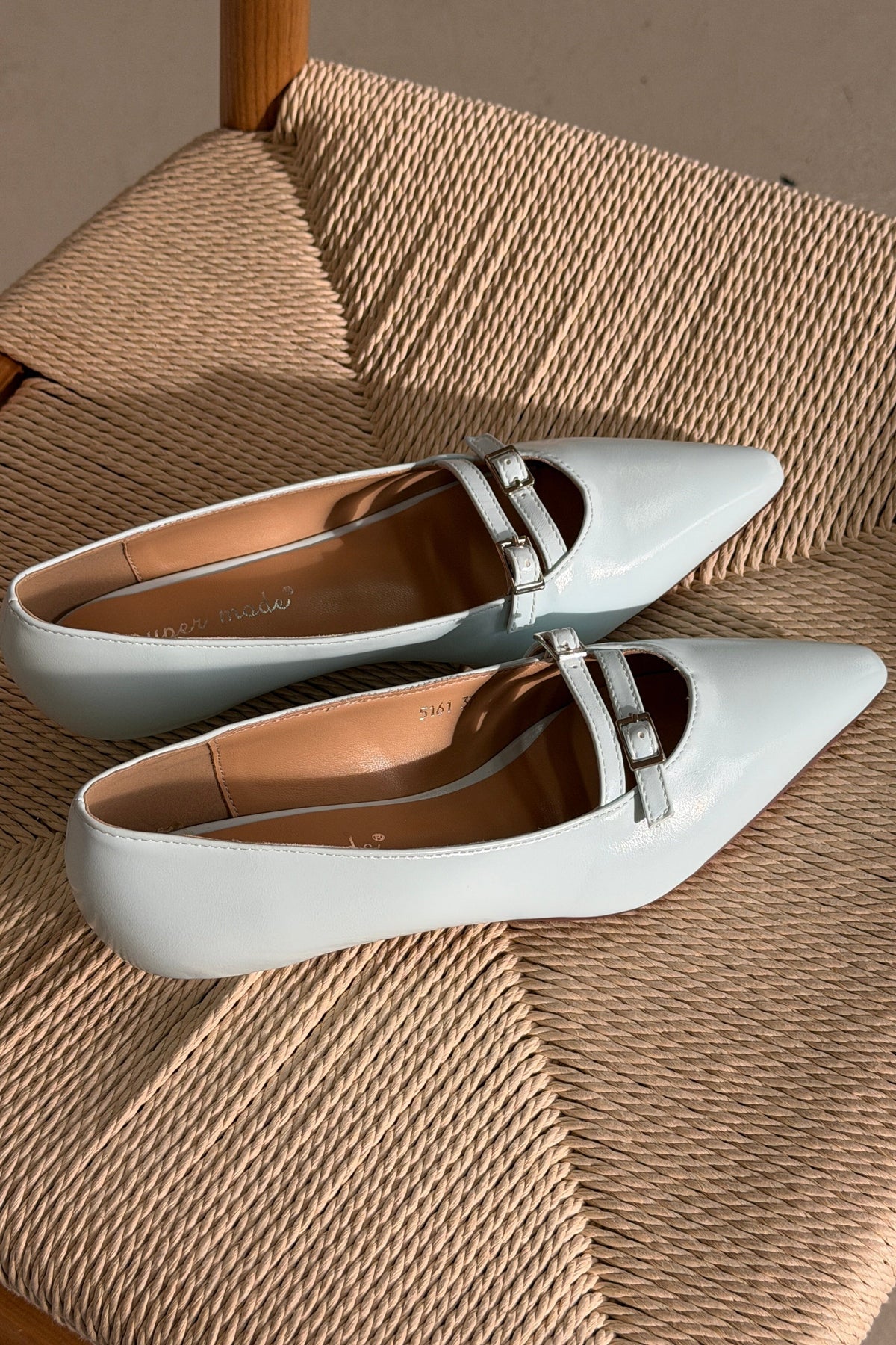 Lichtblauwe ballerina's van Bloom, gemaakt van synthetisch materiaal. De schoenen hebben spitse neuzen en platte hakken.