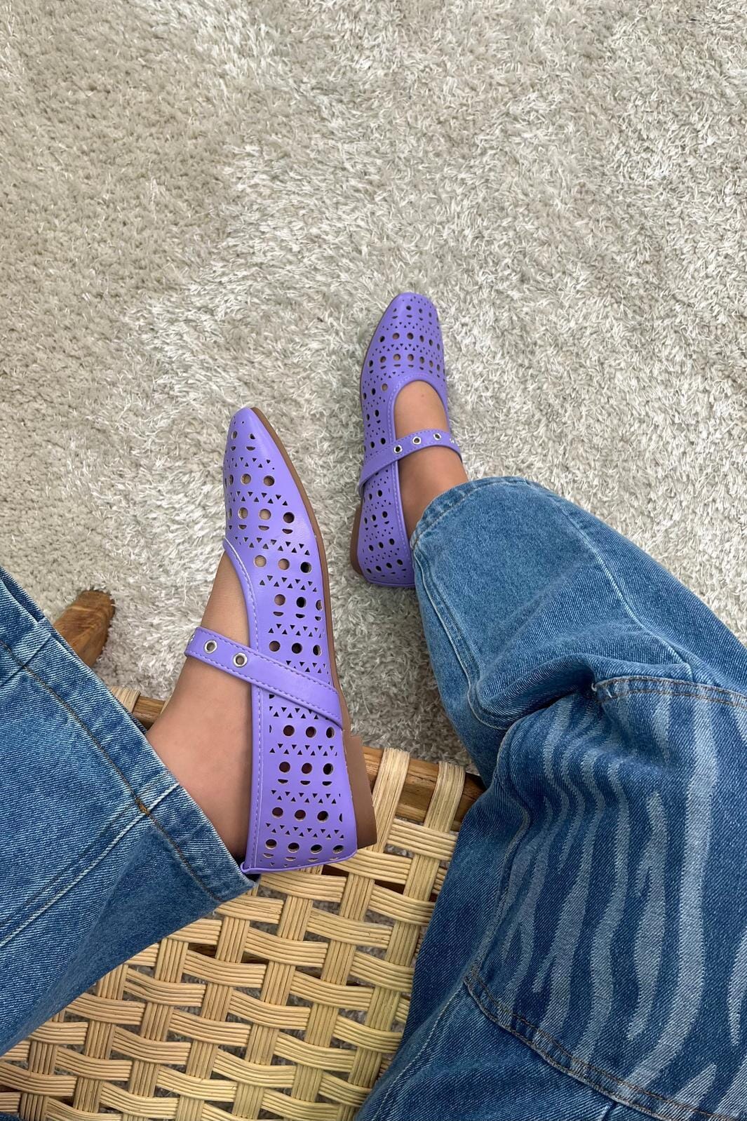 Paarse ballerina van Bloom met gaatjespatroon en gesp. De spitse neus en het decoratieve patroon geven de schoen een karakteristieke uitstraling.