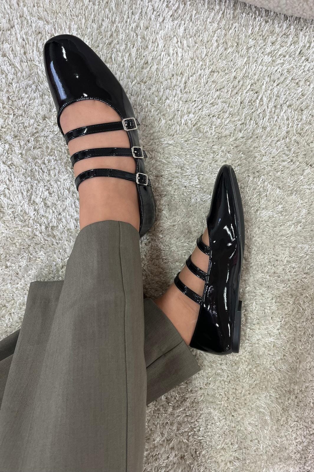 Zwarte gelakte schoenen met drie gespen van Bloom. De spitse neus en de smalle bandjes geven de schoen een klassieke uitstraling die geschikt is voor zowel feestelijke als formele gelegenheden.