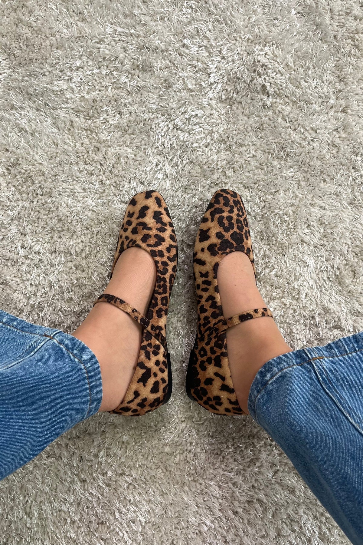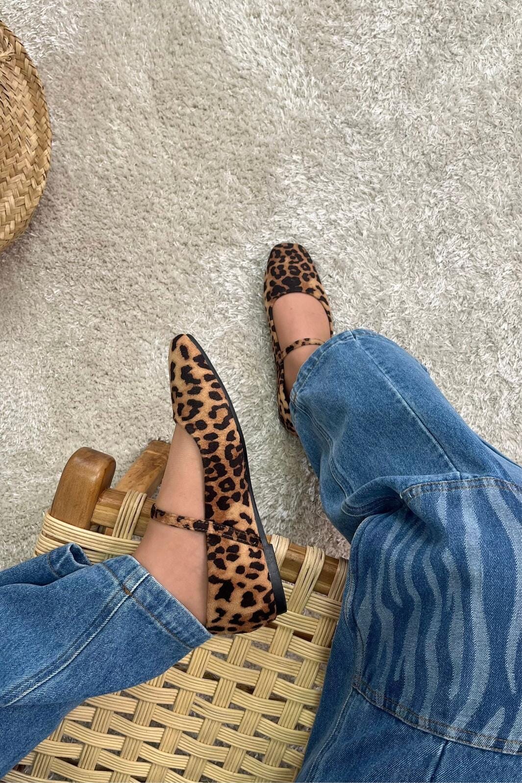 Ballerina van Bloom met luipaardprint in bruine en zwarte tinten. De schoen heeft een amandelneus en een praktische gesp over de enkel.