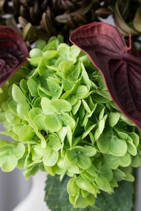 Boeket van Bloom Objects met groene chrysanten, donkergroene amarant en bordeauxkleurige anthurium. Het boeket is gemaakt van latex voor een natuurgetrouwe uitstraling.