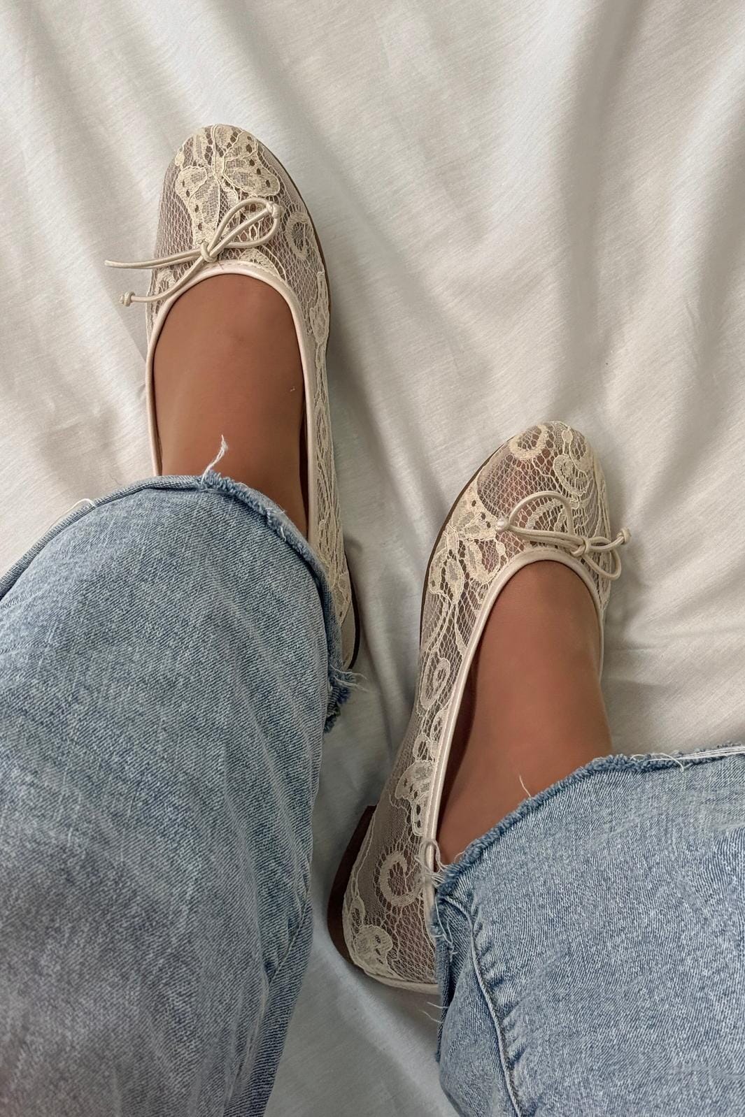 Beige ballerina-schoenen van Bloom met kantoppervlak en strikdetail. De schoenen hebben een lage hak en zijn ontworpen voor formele gelegenheden zoals bruiloften en feesten.