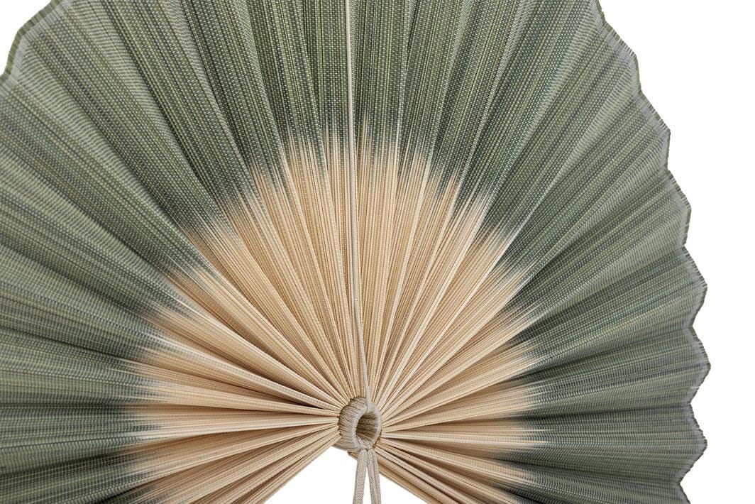 Wanddecoratie van Bloomingville van 100% bamboe met groene plooien en een beige midden. Het ontwerp heeft een halfcirkelvormige waaiervorm met een kwast.