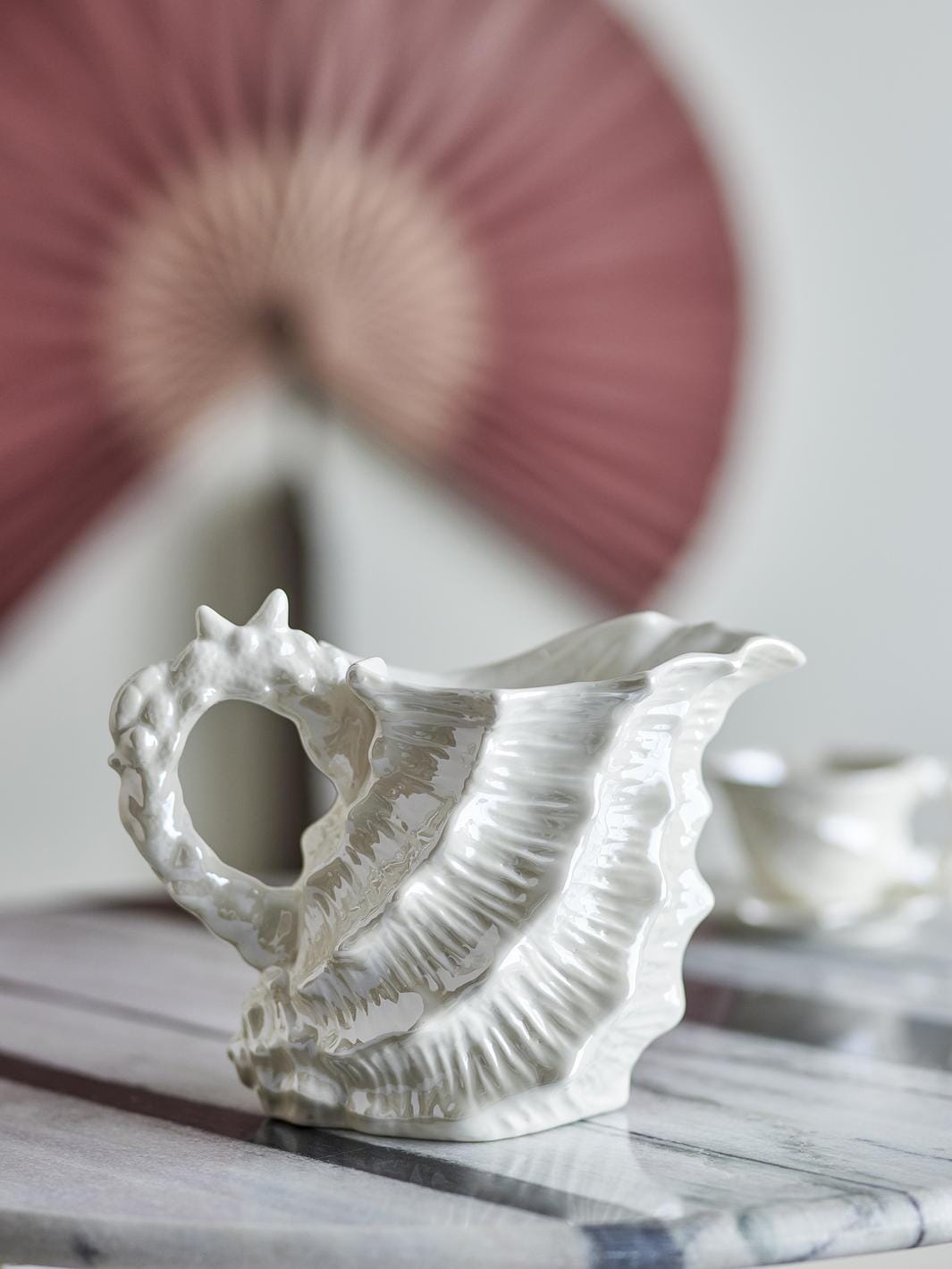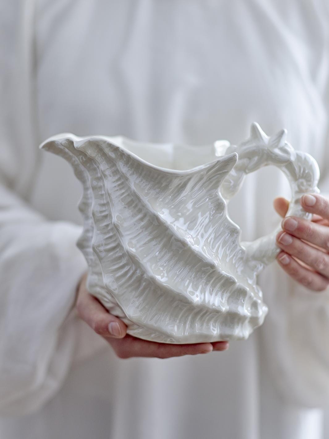 Witte kan van Bloomingville, gemaakt van steengoed met een schelpvorm. Het oppervlak is golvend en glanzend, en het handvat heeft details met schelp- en zeester-motieven.