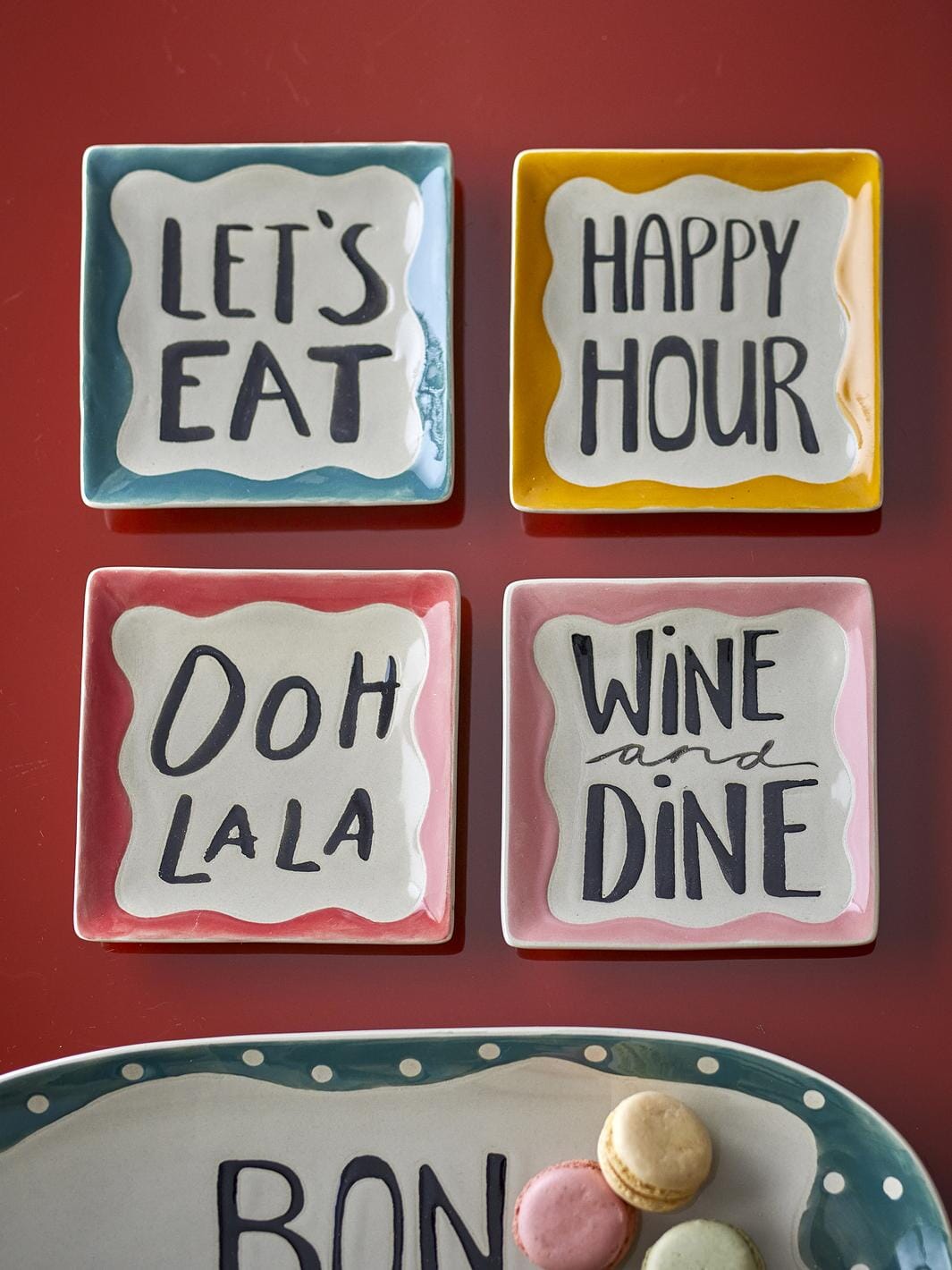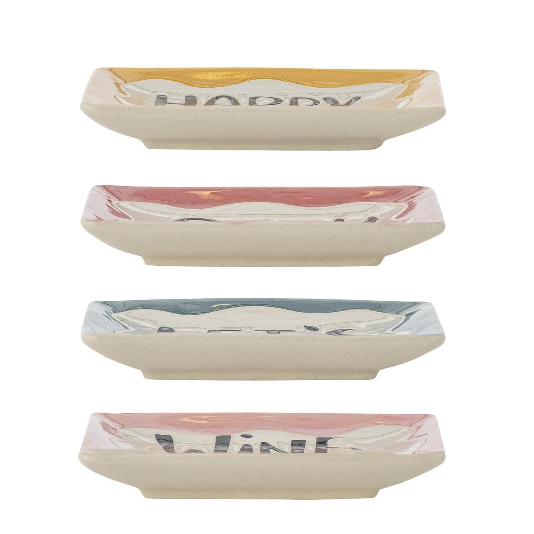Rechthoekige borden van Bloomingville van steengoed met handgeschilderde oppervlakken. Elk bord heeft een crèmekleurig vlak in het midden en gekleurde randen in roze, geel, blauw of rood.