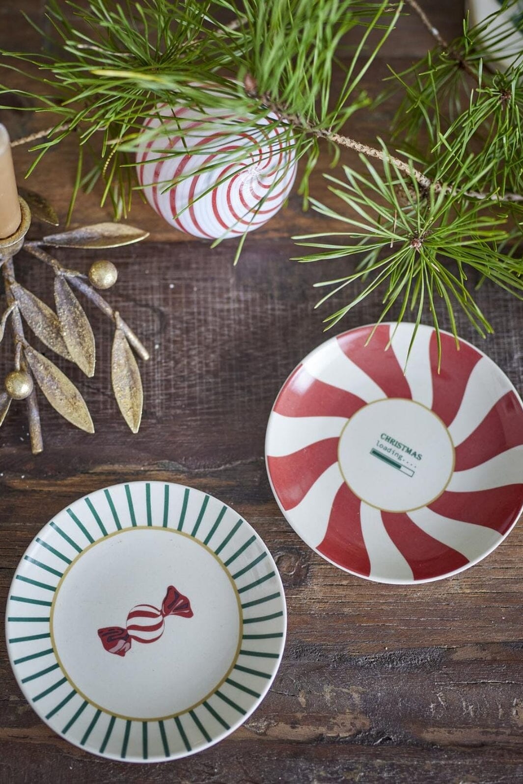 Kerstborden van Bloomingville in aardewerk met een rood spiraalpatroon en groene strepen. Twee verschillende ontwerpen met kerstmotieven op een witte achtergrond.