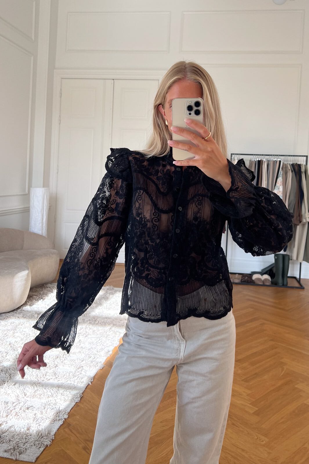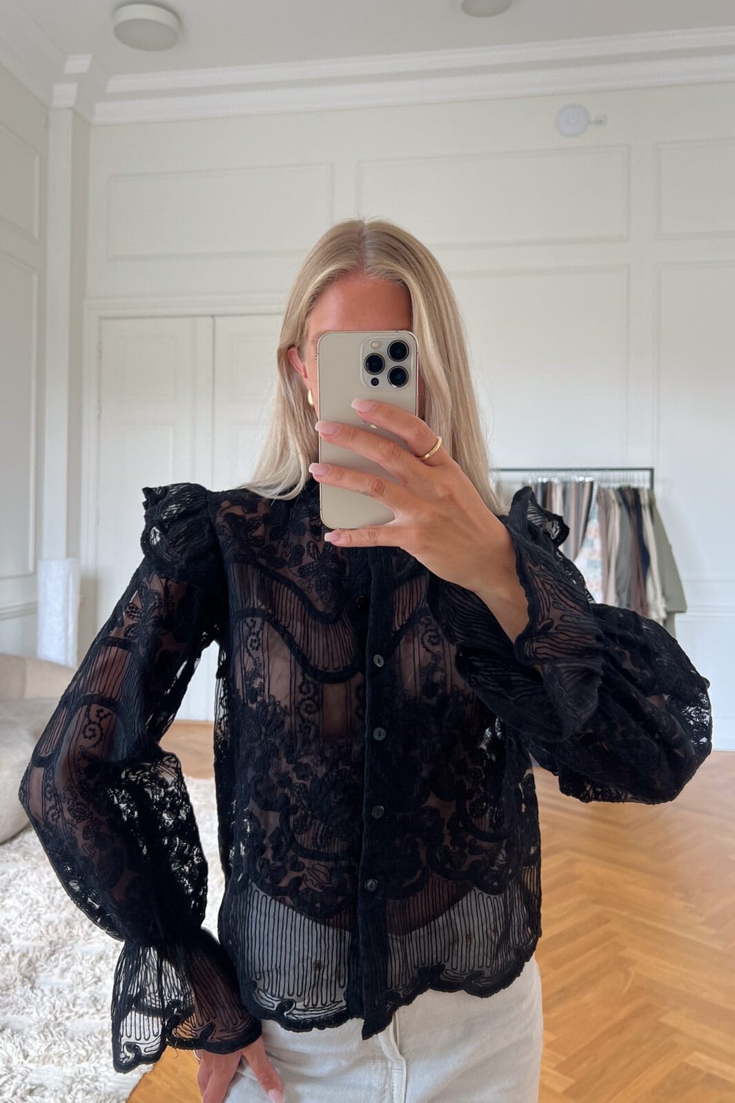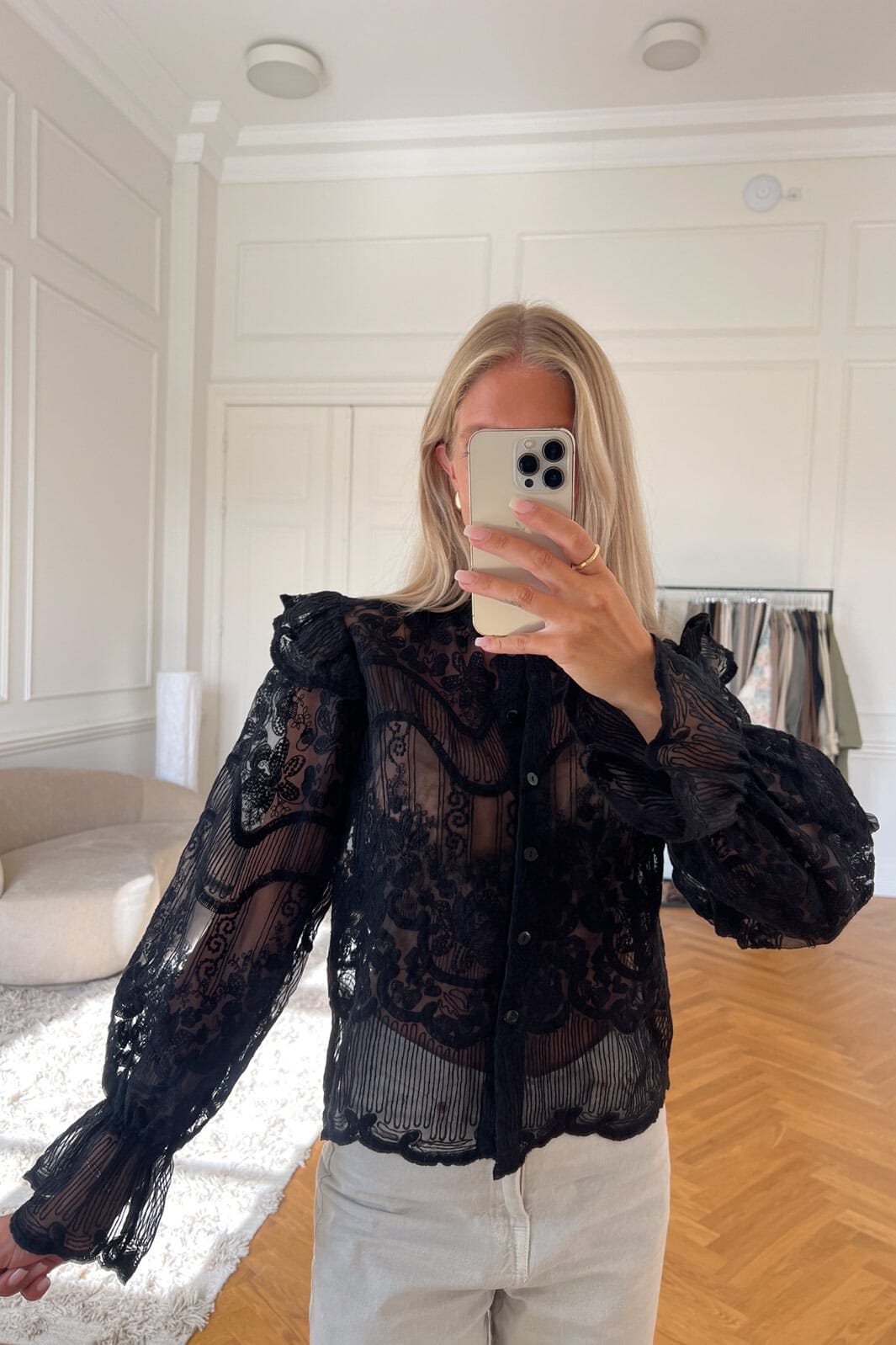 Zwarte blouse van doorschijnend kant met een hoge kraag en knoopsluiting. De blouse heeft pofmouwen met ruches en een losse pasvorm, waardoor hij geschikt is voor zowel alledaagse als feestelijke gelegenheden.