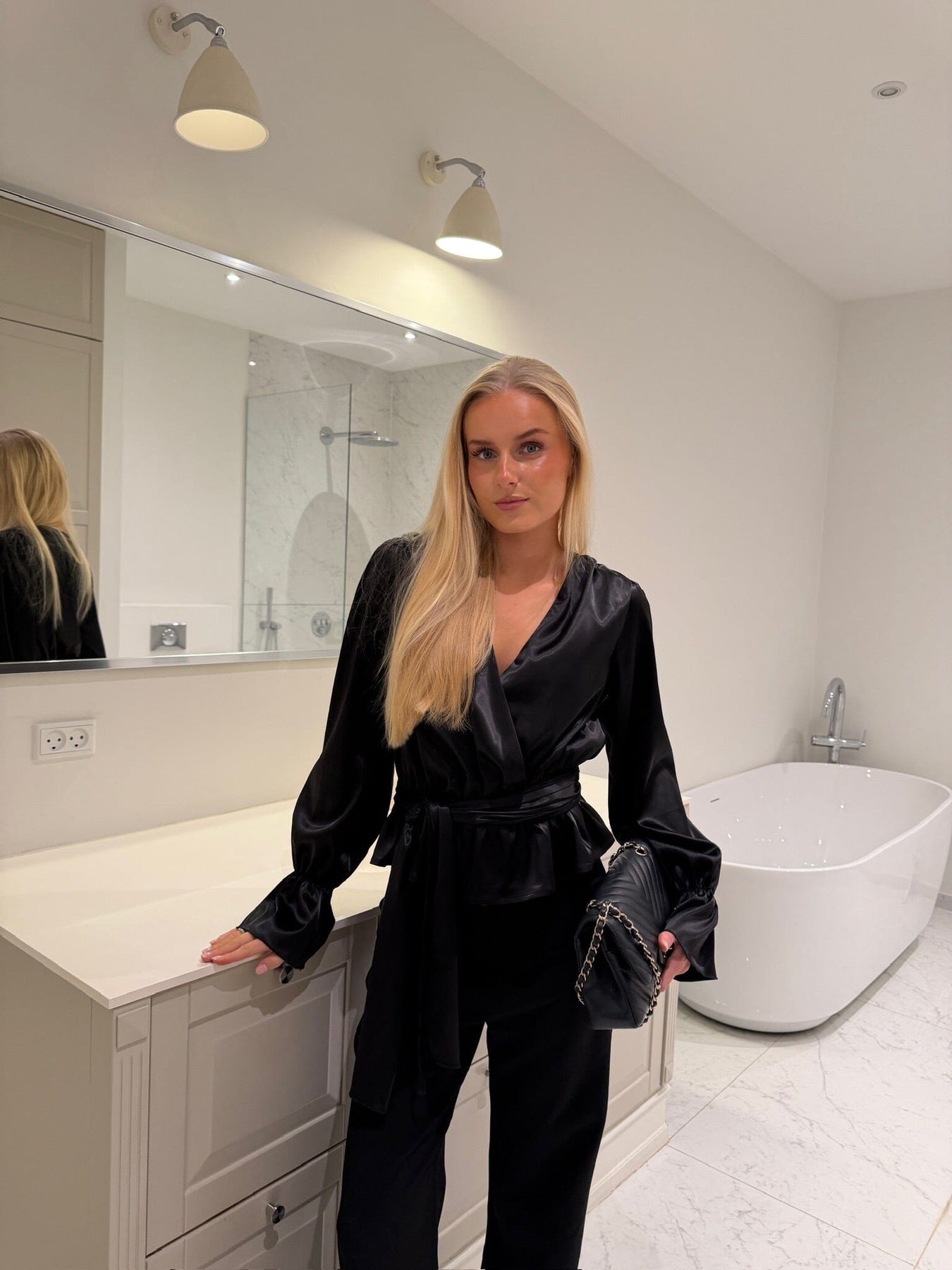 Zwarte satijnen blouse van BYIC met een V-hals en striksluiting. De blouse heeft een losse pasvorm met een geaccentueerde taille en pofmouwen met elastische manchetten.