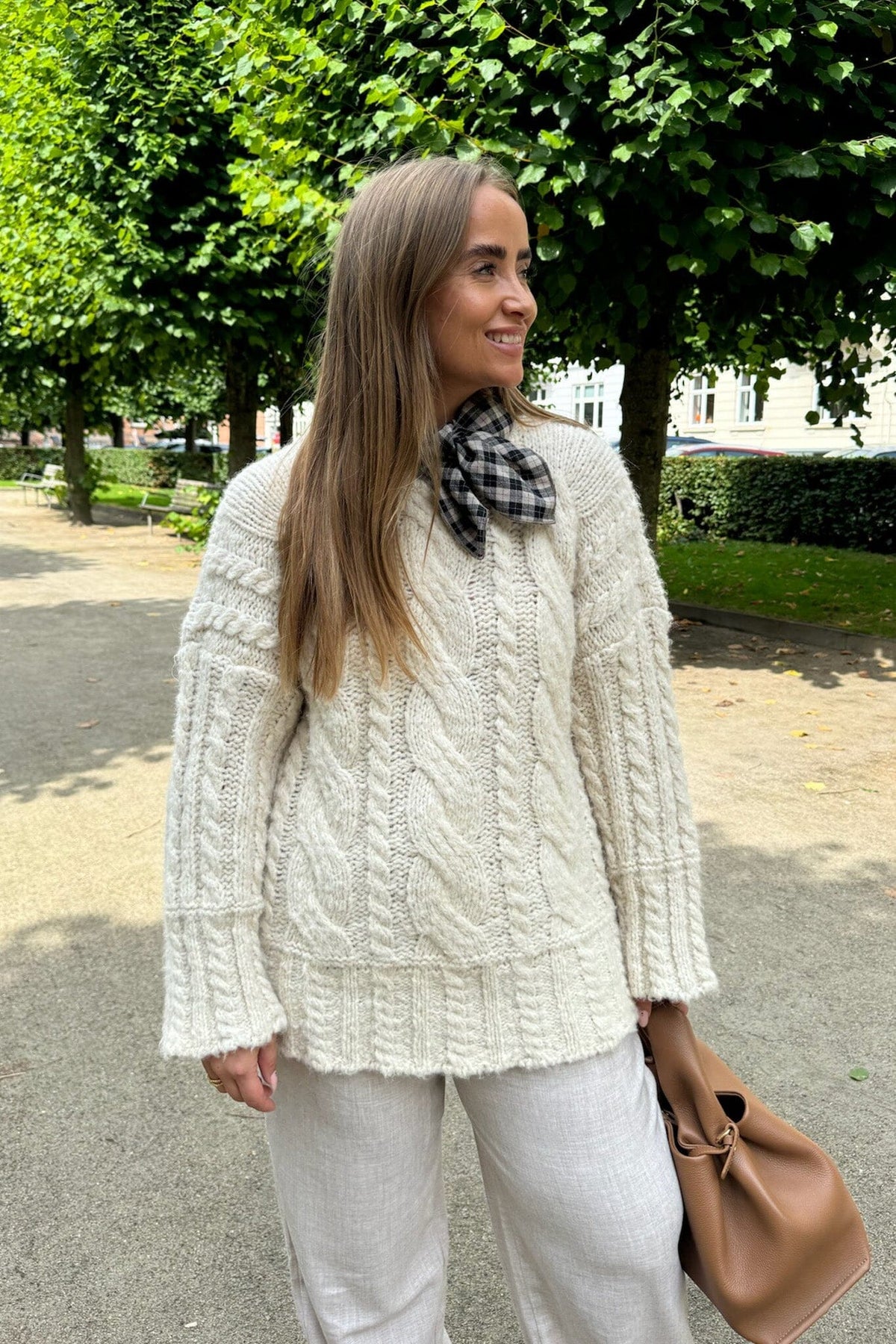 Off-white trui van BYIC met een duidelijk kabelpatroon door het hele breiwerk. De grote mouwen en de losse brei creëren een ontspannen stijl.